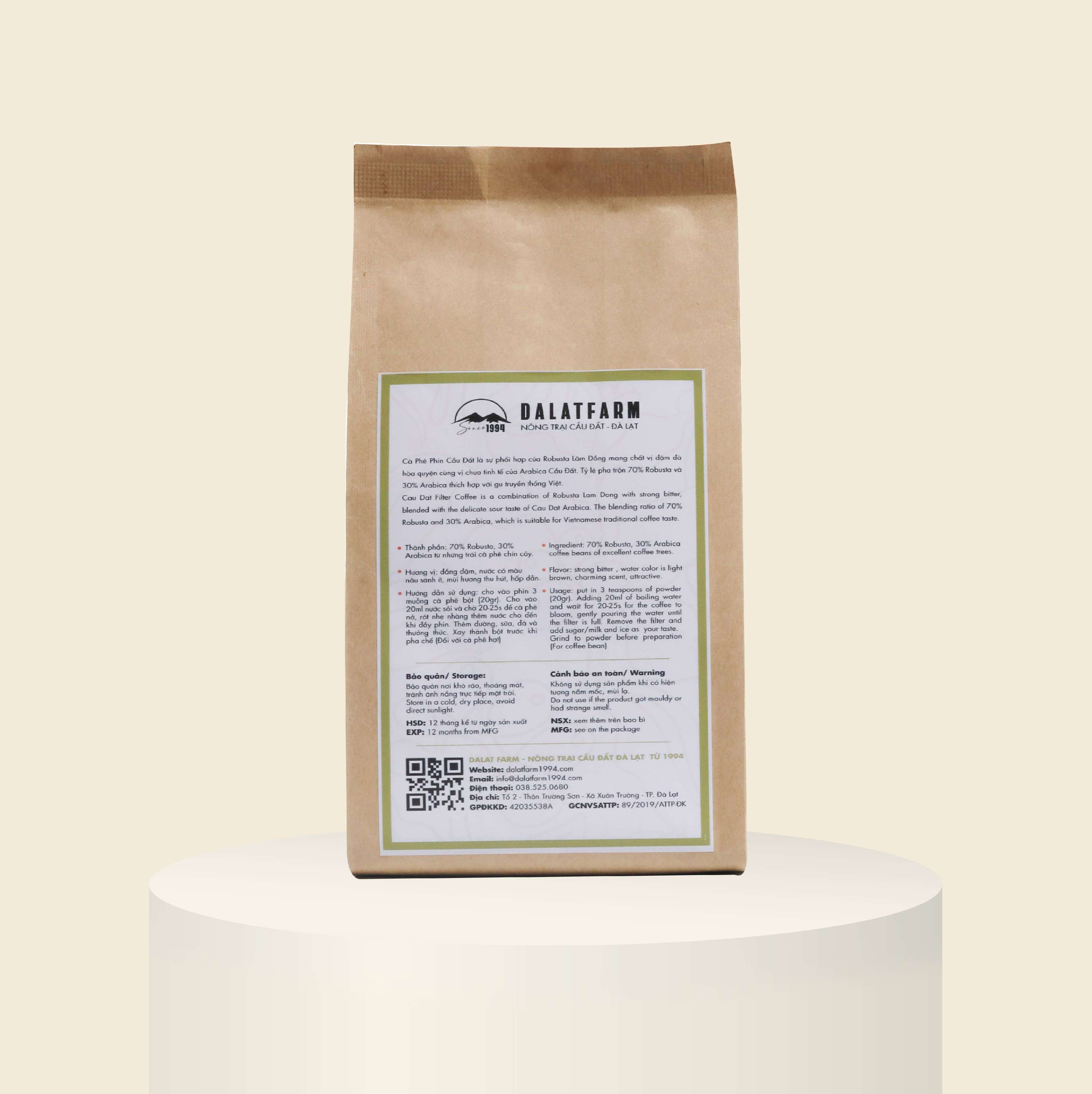 Cà Phê Phin Cầu Đất là sự phối trộn của Robusta Lâm Đồng mang chất vị đậm đà hòa quyện cùng vị chua tinh tế của Arabica Cầu Đất. Tỷ lệ 30% Arabica và 70% Robusta thích hợp cho người gu đậm đà.