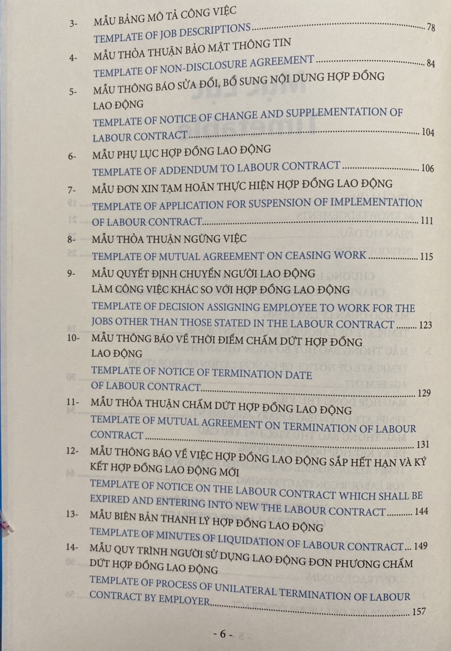 Các biểu mẫu nhân sự về pháp luật lao động được trình bày dưới dạng song ngữ Việt Anh giúp độc giả thuận tiện tham chiếu và áp dụng phù hợp.