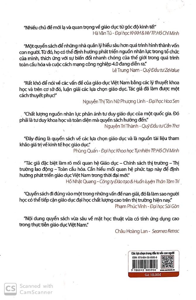 Một quyển sách khiêm tốn về dung lượng nhưng dày về tri thức khoa học…. Hình thức của quyển sách này không quá lạ lẫm so với các ấn phẩm cùng loại. Tuy nhiên, đây có thể được xem là một chuyển khảo khá mới mẻ, liên quan đến kinh tế học giáo dục trong bối cảnh nghiên cứu giáo dục của Việt Nam hiện nay. Nếu đọc đến chương cuối cùng của chuyển khảo, quý vị sẽ cảm nhận được sự bất ngờ với cách tiếp cận khá triệt để và hấp dẫn về giáo dục, đó là xem giáo dục như đầu tư vốn con người và không phải lúc nào cũng nên đầu tư loại vốn này, Nó có ích cho những ai thật sự quan tâm, tìm hiểu, nghiên cứu và ứng dụng vào việc ra quyết định về giáo dục cả trên bình diện cá nhân và gia đình, tổ chức, cũng như đối với các nhà hoạch định và thực thi chính sách.