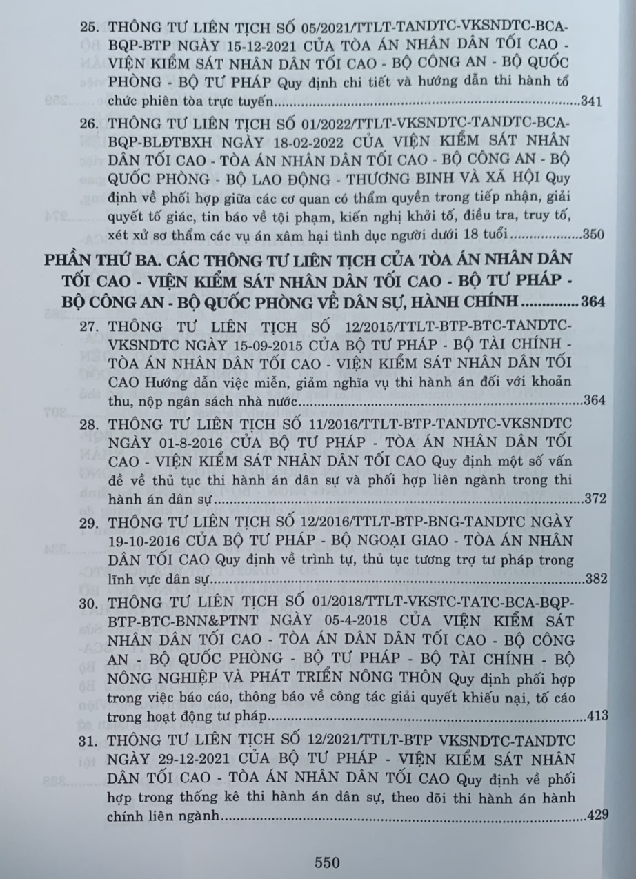 Phần thứ ba: Các Thông tư liên tịch của Tòa án nhân dân tối cao - Viện Kiểm sát nhân dân tối cao - Bộ Tư pháp - Bộ Công an - Bộ Quốc phòng về dân sự, hành chính