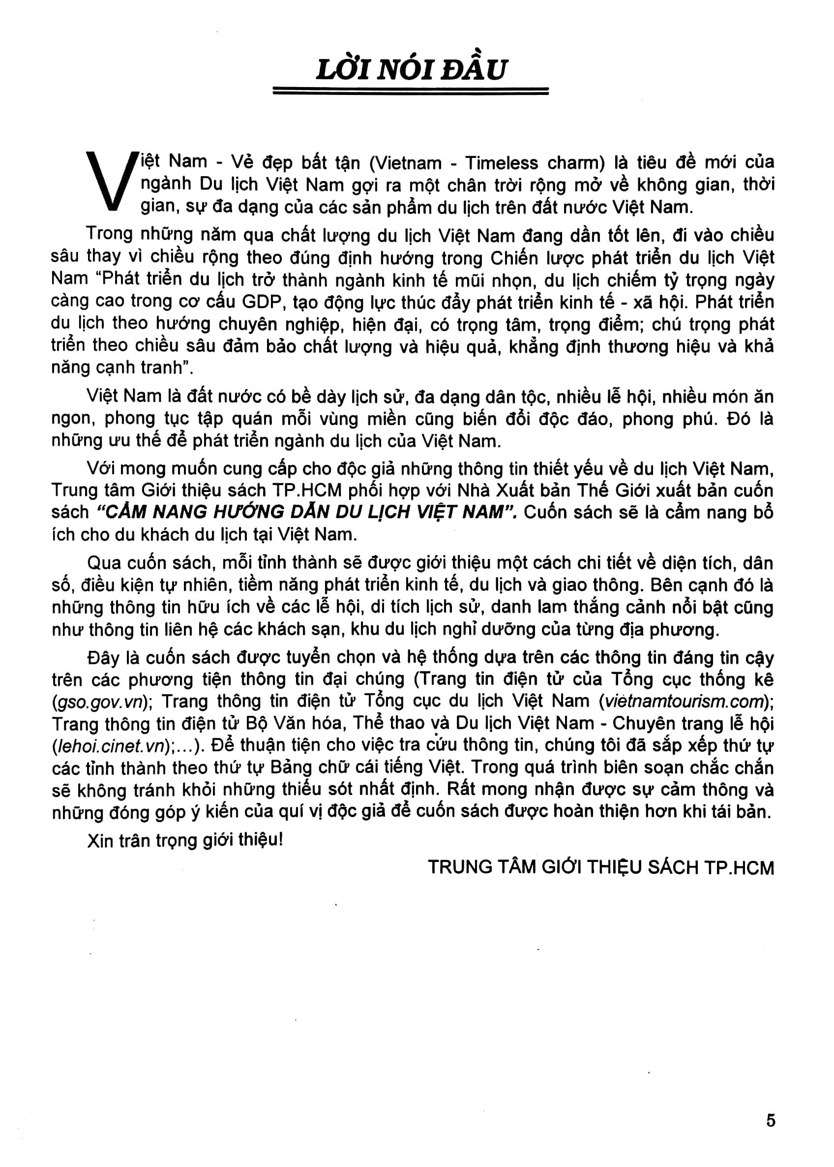 Cẩm Nang Hướng Dẫn Du Lịch Việt Nam Việt Nam là đất nước có bề dày lịch sử, đa dạng dân tộc, nhiều lễ hội, nhiều món ăn ngon, phong tục tập quán mỗi vùng miền cũng biến đổi độc đáo, phong phú. Trong những năm qua, du lịch Việt Nam đang trên đà phát triển, lượng khách quốc tế đến cũng như kháchdu lịch nội địa ngày càng tă lịch Việt Nam ngày càng được biết đến nhiều hơn trên thế giới, nhiều điểm đến trong nước được bình chọn là địa chỉ yêu thích của du khách quốc tế.Du lịch đang ngày càng nhận được sự quan tâm của toàn xã hội. Chất lượng du lịch Việt Nam đang dần tốt lên, đi vào chiều sâu thay vì chiều rộng theo đúng định hướng trong Chiến lược phát triển du lịch Việt Nam “Phát triển du lịch trở thành ngành kinh tế mũi nhọn, du lịch chiếm tỷ trọng ngày càng cao trong cơ cấu GDP, tạo động lực thúc đẩy phát triển kinh tế - xã hội. Phát triển du lịch theo hướng chuyên nghiệp, hiện đại, có trọng tâm, trọng điểm; chú trọng phát triển theo chiều sâu đảm bảo chất lượng và hiệu quả, khẳng định thương hiệu và khả năng cạnh tranh”. Với mong muốn cung cấp cho độc giả những thông tin thiết yếu về du lịch Việt Nam, quyển Cẩm Nang Hướng Dẫn Du Lịch Việt Nam đã được xuất bản và sẽ là cẩm nang bổ ích cho du khách du lịch tại Việt Nam. Sách gồm 63 phần giới thiệu về du lịch của 63 tỉnh, thành phố trong cả nước theo thứ tự bảng chữ cái tiếng Việt để thuận tiện cho việc tra cứu thông tin. Qua cuốn sách, độc giả có thể tra cứu thông tin về mỗi Tỉnh thành về diện tích, dân số, điều kiện tự nhiên, tiềm năng phát triển kinh tế và du lịch, tra cứu những đường giao thông thuận tiện đi qua mỗi tỉnh, thành phố. Bên cạnh đó là những thông tin hữu ích về những đặc sản địa phương, các địa điểm tham quan, thời gian tổ chức các lễ hội, địa chỉ của các di tích lịch sử, danh lam thắng cảnh nổi bật cũng như thông tin liên hệ các khách sạn, vướng mắc khi gặp sự cố (tìm kiếm cứu nạn, lực lượng cảnh sát phản ứng nhanh, cấp cứu y tế, gọi khẩn cấp công an từng địa phương), khu du lịch nghỉ dưỡng của từng Tỉnh, Thành phố.