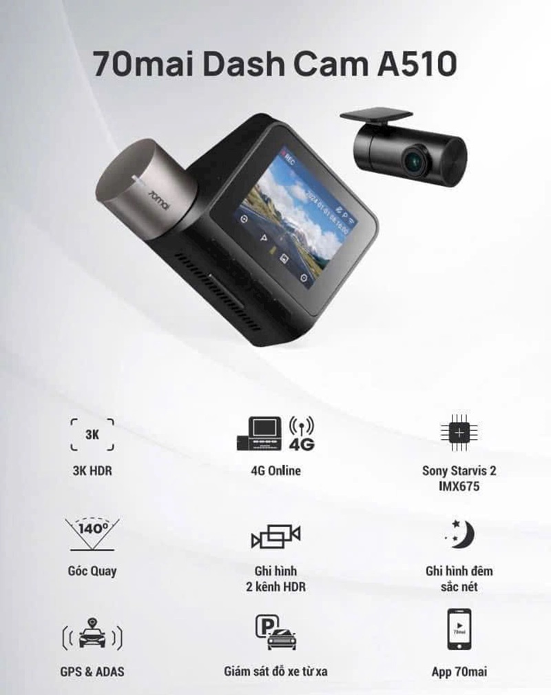 Độ phân giải video : 2K 1440P Ống kính : Camera trước 150° Ghi hình vòng lặp : Có Wifi : Có GPS : Có Công nghệ hình ảnh giảm nhiễu Hỗ trợ tái hiện