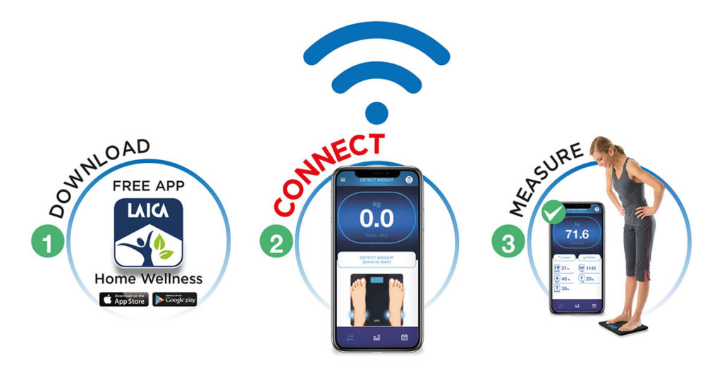 TÍNH NĂNG NỔI BẬT. - Kết nối bluetooth với điện thoại thông minh qua ứng dụng “Laica Home Wellness” có sẵn trên kho ứng dụng IOS (App Store); Android (Google Play). - Cân, đo 6