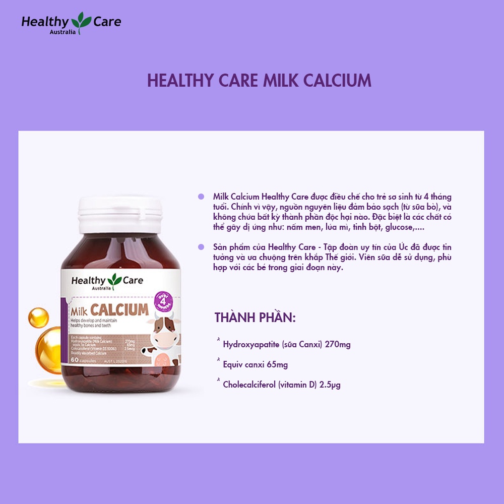 - Lưu ý khi sử dụng: Không uống Milk Calcium Healthy Care sẽ gây khó ngủ Không uống Milk Calcium Healthy Care khi đói Trẻ em dưới 4 tuổi có thể vặn viên uống vào thìa bón cho bé hoặc trộn với thức ăn Sử dụng sản phẩm đúng hướng dẫn, không tự ý tăng liều dùng khi chưa có chỉ dẫn của chuyên gia Đậy kín nắp sản phẩm sau khi dùng, bảo quản nơi khô thoáng, tránh tiếp xúc trực tiếp với ánh nắng mặt trời. Đối tượng sử dụng Canxi Milk Úc Trẻ em còi xương, còi cọc, chậm lớn Trẻ chậm mọc răng, răng dễ bị hư Trẻ chậm biết đi, biếng ăn, hay quấy khóc đêm Đôi nét về thương hiệu Sản phẩm Milk Calxium Healthy Care thuộc thương hiệu Healthy Care là một trong nhiều thương hiệu chuyên về sức khỏe, được đánh giá là thương hiệu nổi tiếng tại Úc. Tất cả sản phẩm của thương hiệu Healthy Care đều được sự tư vấn của hơn 250 chuyên gia chăm sóc sức khỏe trên toàn thế giới. Là thương hiệu cung cấp nguồn sản phẩm chăm sóc sức khỏe trực tiếp cho trẻ em. Với mục tiêu cung cấp các sản phẩm chăm sóc sức khỏe được kết hợp giữa khoa học và thiên nhiên, mang đến sản phẩm vượt trội cho sức khỏe con người, các dòng sản phẩm của Healthy Care hiện nay đang có là: xương khớp, mắt, trí não, sắc đẹp, tiêu hóa, giải độc … dành cho đối tượng trẻ em, phụ nữ, nam giới. Một số câu hỏi thắc mắc về Milk Calxium Healthy Care