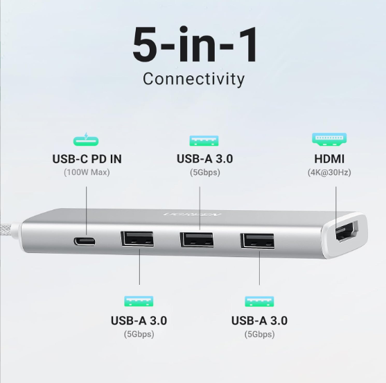 USB-C Hub 5 trong 1 Ugreen 35580 - Kết nối 5 trong 1: được trang bị một cổng HDMI 4K, một cổng USB C PD 100W và ba cổng USB A 3.0 hỗ trợ tốc độ