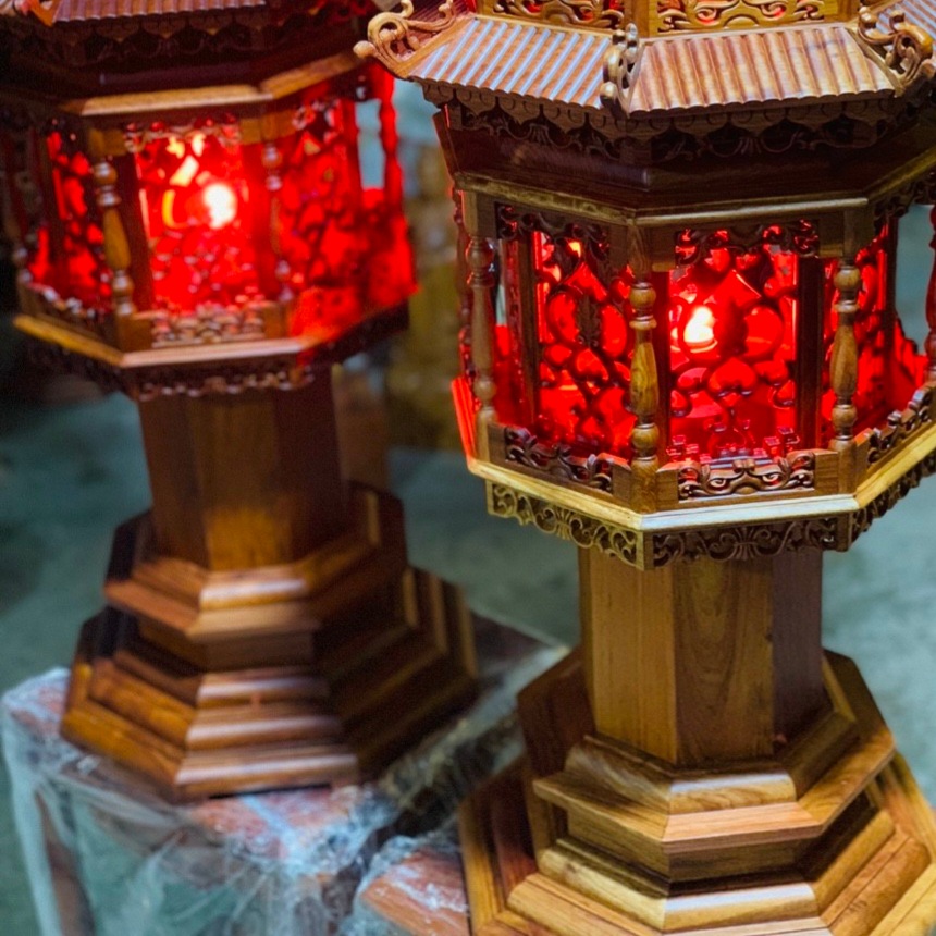 Ý nghĩa, vai trò của cặp đèn thờ | Giới thiệu cặp đèn điện đặt bàn thờ gỗ xà cừ cao 50cm