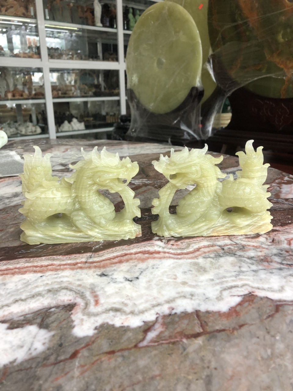 Chất liệu: Đá ngọc Onyx Kích thước: Dài 12 cm x Rộng 3,5 cm x Cao 9 cm và Dài 15 cm x Rộng 3,5 cm x Cao 10 cm Khối lượng: 750g và 1,2 kg Ý nghĩa của Rồng đá phong thủy