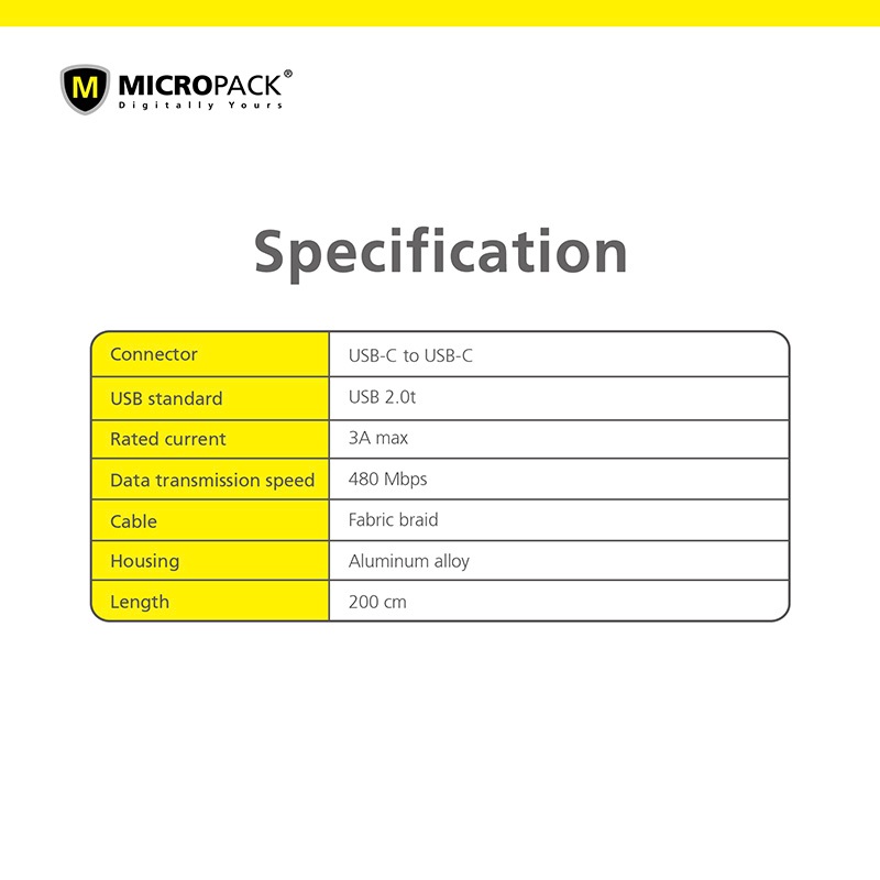 • Chuẩn USB: USB 2.0 • Đầu nối: USB-C sang USB-C • Tốc độ truyền dữ liệu: 480Mbps • Dòng điện định mức: tối đa 3A • Cáp: Bện sợi KEVLAR chống đạn • Chất liệu đầu cắm: Hợp kim nhôm