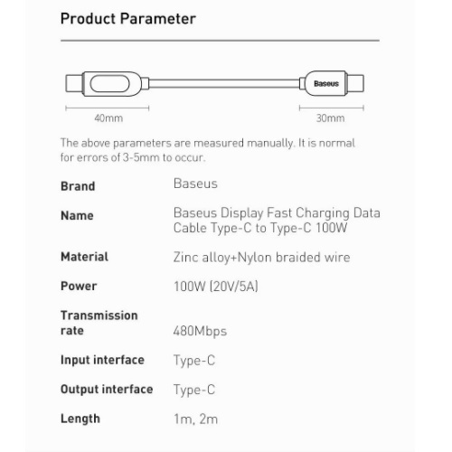 ✨Cáp sạc nhanh Baseus C to C 100W màn led, Cáp sạc nhanh 100W Baseus Display Fast Charging Data Cable Type C to C 100W (20V/5A) - Hàng chính hãng