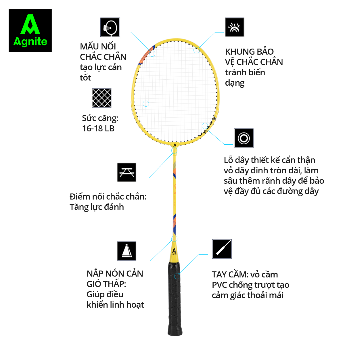THÔNG SỐ CƠ BẢN Thương hiệu: Agnite Mã số: F2108 Số lượng: Hai chiếc Màu sắc: xanh lam + đỏ Trọng lượng vợt: 110 ± 5g Độ cứng thanh: cứng Lực căng dây: 16-18LB Chiều
