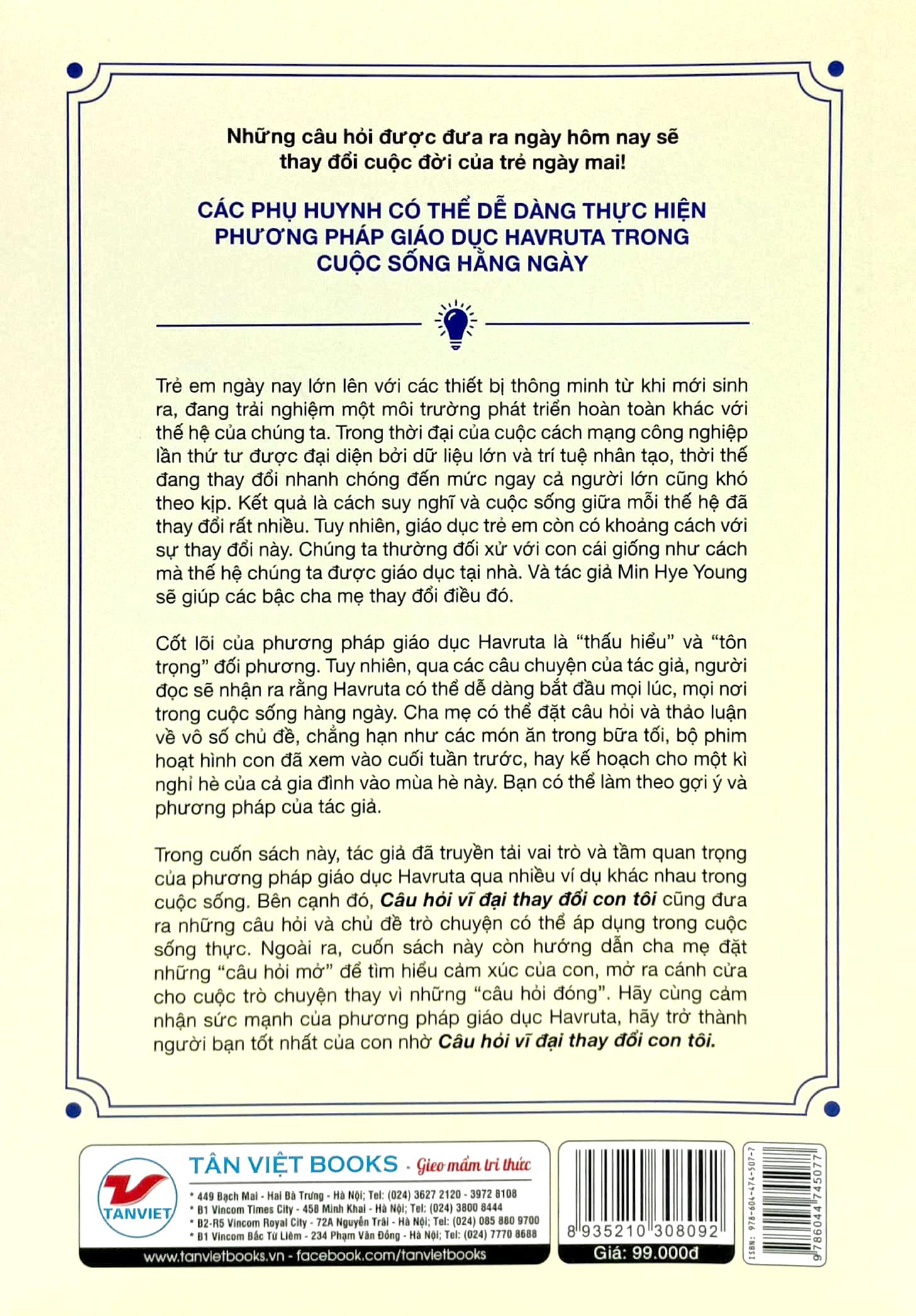 Kết quả là cách suy nghĩ và cuộc sống giữa các thế hệ đã thay đổi rất nhiều. Tuy nhiên, giáo dục trẻ em còn có khoảng cách với sự thay đổi này. Chúng ta thường đối xử với con cái giống như cách mà thế hệ chúng ta được giáo dục tại nhà. Và tác giả Min Hye Young sẽ giúp các bậc cha mẹ thay đổi điều đó bằng phương pháp giáo dục Havruta trong cuốn sách Câu hỏi vĩ đại thay đổi con tôi – Havruta.