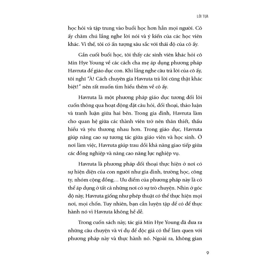 Kết quả là cách suy nghĩ và cuộc sống giữa các thế hệ đã thay đổi rất nhiều. Tuy nhiên, giáo dục trẻ em còn có khoảng cách với sự thay đổi này. Chúng ta thường đối xử với con cái giống như cách mà thế hệ chúng ta được giáo dục tại nhà. Và tác giả Min Hye Young sẽ giúp các bậc cha mẹ thay đổi điều đó bằng phương pháp giáo dục Havruta trong cuốn sách Câu hỏi vĩ đại thay đổi con tôi – Havruta.