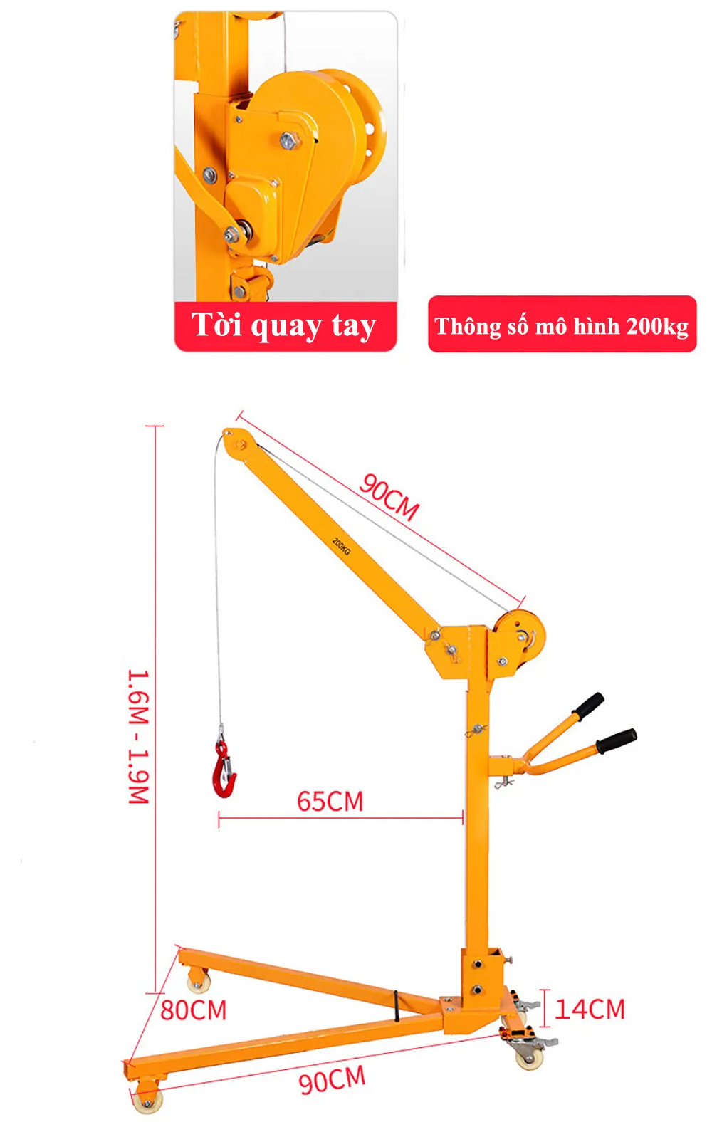 Thông số kĩ thuật: Trọng lượng: 38 kg Trọng Tải: 200 kg Cao: 185 cm Càng vươn: 108 cm Chiều dài cần: 105 cm Khe mở càng: 82cm Độ dài cáp: 3.5m Kích cỡ cáp:
