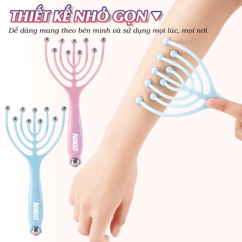 Thiết kế nhỏ gọn thích hợp sử dụng mọi lúc Ưu điểm của cây massage đầu bạch tuộc cao cấp Nikio NK-01C: 10 quả bóng massage xoay 360 độ Nikio NK-01C được thiết kế với 10 quả bóng massage có khả năng xoay linh hoạt 360 độ. Các bóng massage tác động đa điểm vào các huyệt đạo vùng đầu giúp kích thích tuần hoàn máu và cải thiện cảm giác căng thẳng nhanh chóng. Các quả bóng xoay đều, mang lại cảm giác thư giãn tối đa cho người dùng. Bóng lăn mượt, hạn chế kẹt tóc Với thiết kế bóng lăn mượt mà, sử dụng cây massage đầu Nikio NK-01C sẽ tránh được tình trạng kẹt tóc, mang lại sự thoải mái và an toàn khi sử dụng. Bạn có thể yên tâm sử dụng sản phẩm mà không lo bị đau hay rối tóc. Thiết kế giống bàn tay người Cây massage đầu Nikio NK-01C có thiết kế giống bàn tay người, giúp mang lại trải nghiệm massage chân thật và dễ chịu. Thiết kế này không chỉ tạo cảm giác thoải mái mà còn giúp massage đều khắp vùng da đầu. Tay cầm lõm, cầm nắm thoải mái Tay cầm của cây matxa đầu Nikio NK-01C được thiết kế lõm, giúp cầm nắm thoải mái và chắc chắn. Bạn có thể dễ dàng điều chỉnh lực massage theo ý muốn mà không bị trơn trượt hay mỏi tay. Chất liệu tốt, đồ đàn hồi cao Sản phẩm được làm từ chất liệu nhựa cao cấp, có độ đàn hồi cao, đảm bảo độ bền và an toàn cho người sử dụng. Chất liệu này cũng giúp sản phẩm nhẹ nhàng và dễ dàng vệ sinh sau khi sử dụng. Kiểu dáng đẹp, màu sắc đa dạng Cây mát xa đầu Nikio NK-01C có kiểu dáng đẹp và hiện đại, với nhiều màu sắc để lựa chọn như xanh, hồng,... phù hợp với sở thích cá nhân và tạo điểm nhấn thẩm mỹ cho sản phẩm. Thiết kế nhỏ gọn, tiện dụng Với thiết kế nhỏ gọn, người dùng có thể dễ dàng mang cây massage đầu Nikio NK-01C theo bên mình và sử dụng mọi lúc, mọi nơi. Dù là ở nhà, văn phòng hay khi đi du lịch, bạn đều có thể tận hưởng những phút giây thư giãn với cây massage đầu cao cấp này. Lợi ích khi sử dụng: