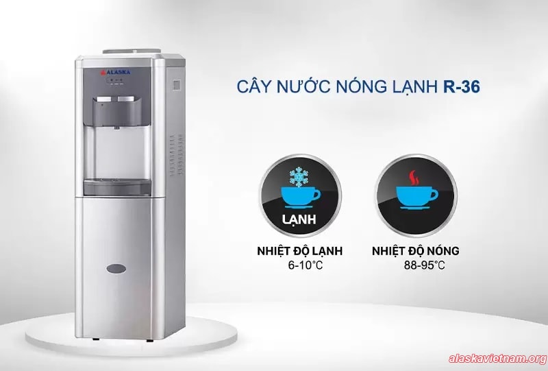 Máy nước nóng lạnh Alaska R-36C làm lạnh bằng gas R134a ( loại gas dùng cho tủ lạnh) thân thiện với môi trường, cho khả năng làm lạnh nhanh hơn, đáp ứng nhu cầu uống nước của nhiều người.