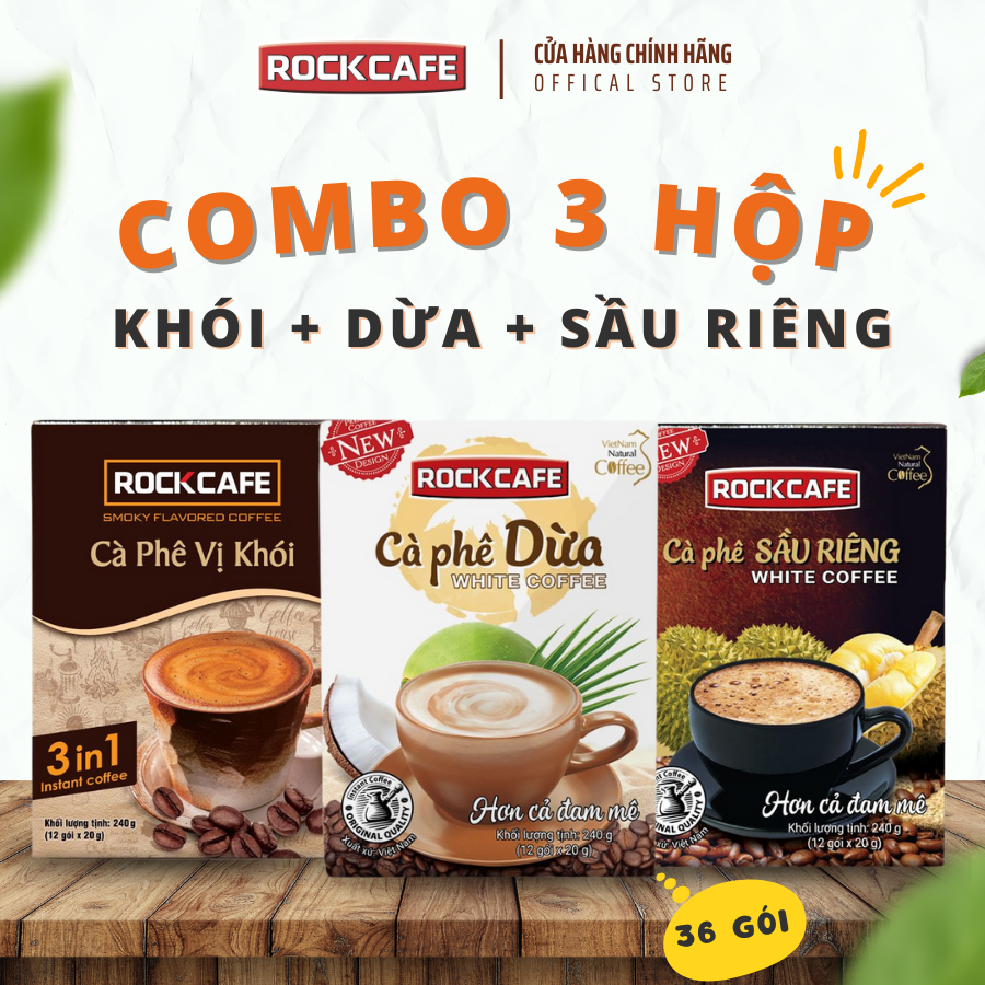 · Cà phê sầu riêng - Rockcafe Durian White coffee là sự kết hợp giữa cà phê trắng với vị sầu riêng ngọt bùi. So với vị đắng đậm đà của cà phê đen có thể át đi mùi vị của sầu riêng thì cà phê trắng với vị chua nhẹ và ít vị đắng sẽ giúp bạn có thể cảm nhận được vị cà phê trong khi vẫn có thể nếm được vị ngọt bùi đặc trưng của sầu riêng.