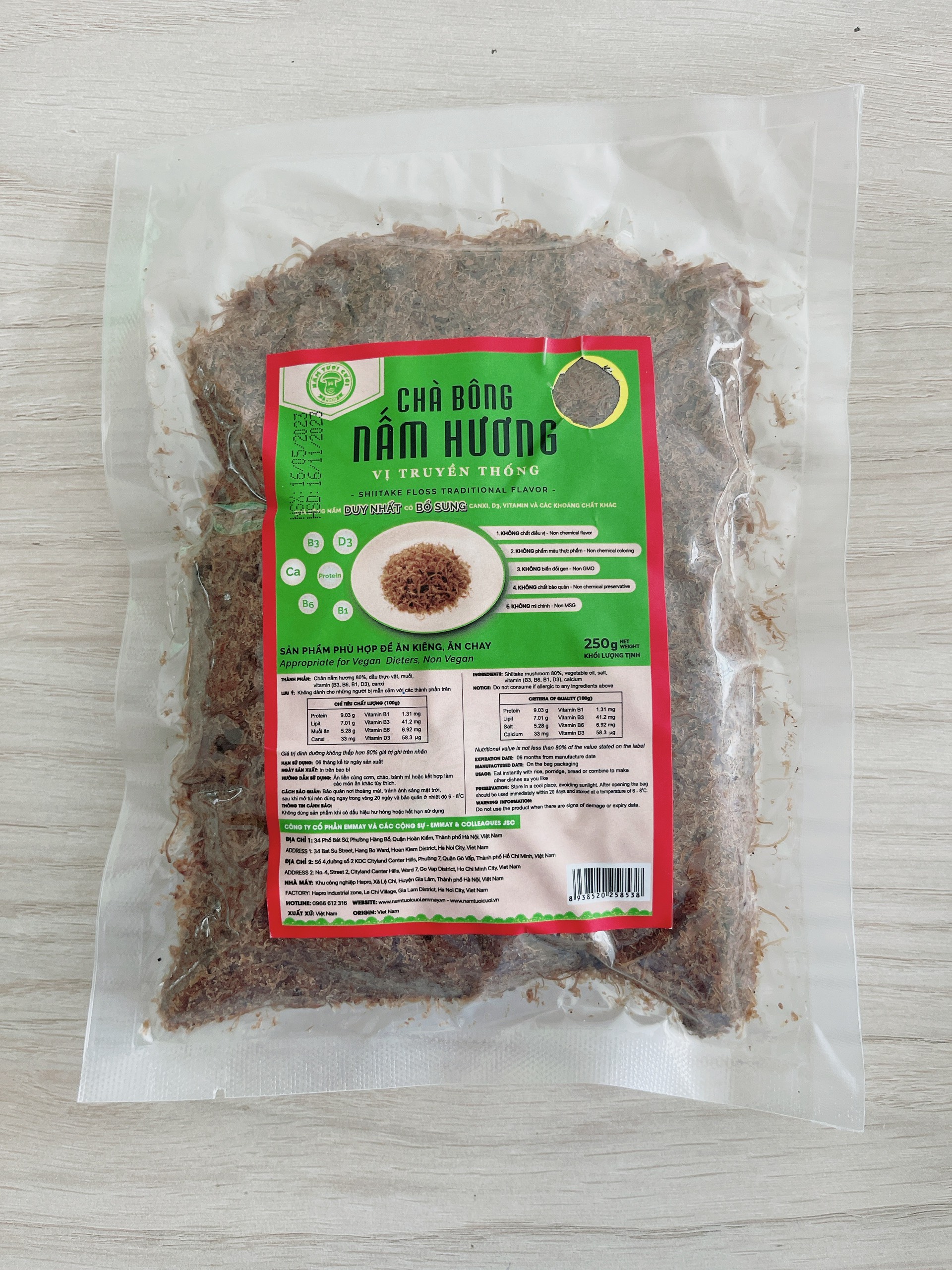 - Lưu ý: không dành cho những người mẫn cảm với các thành phần trên ĐẶC ĐIỂM NỔI BẬT: Chà bông nấm vị truyền thống túi 250g không chất phụ gia và chất bảo quản nên giữ được hương vị tươi ngon của nấm, an toàn đối với sức khỏe người tiêu dùng. Quy trình sản xuất đảm bảo vệ sinh an toàn thực phẩm, đóng gói cẩn thận HƯỚNG DẪN SỬ DỤNG:
