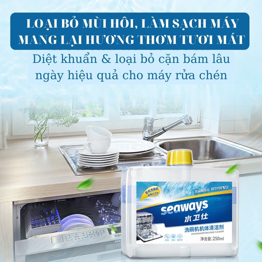 DUNG DỊCH VỆ SINH MÁY RỬA CHÉN SEAWAYS chai 250ml: Là dòng sản phẩm vệ sinh cao cấp chuyên dụng dành cho mọi loại máy rửa chén bát. Công thức đặc biệt làm làm sạch & bảo vệ máy khỏi sự ăn mòn.