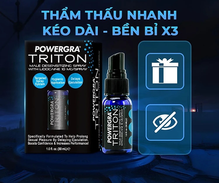 Mua tại TiktokPowergra Triton là chai xịt chứa thành phần 9.6% Lidoc@in kéo dài cuộc yêu giúp nam giới tự tin và thể hiện bản lĩnh đàn ông đích thực. Sản phẩm có hương bạc hà thơm mát và đặc biệt không gây phản ứng phụ. Chai xịt Powergra Triton phát huy hiệu quả ngay và dễ sử dụng. Từ nay, nam giới không còn phải lo lắng về việc làm thế nào để kéo dài thời gian “yêu”. Anh em và “đối tác” của mình được tận hưởng trọn vẹn những cảm xúc, cung bậc khi “yêu” mà không còn thấy tự ti như trước nữa.