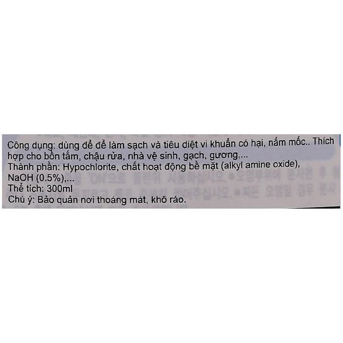 Thành phần : Hypochlorite, chất hoạt động bề mặt, Surgactant , Fragrance..