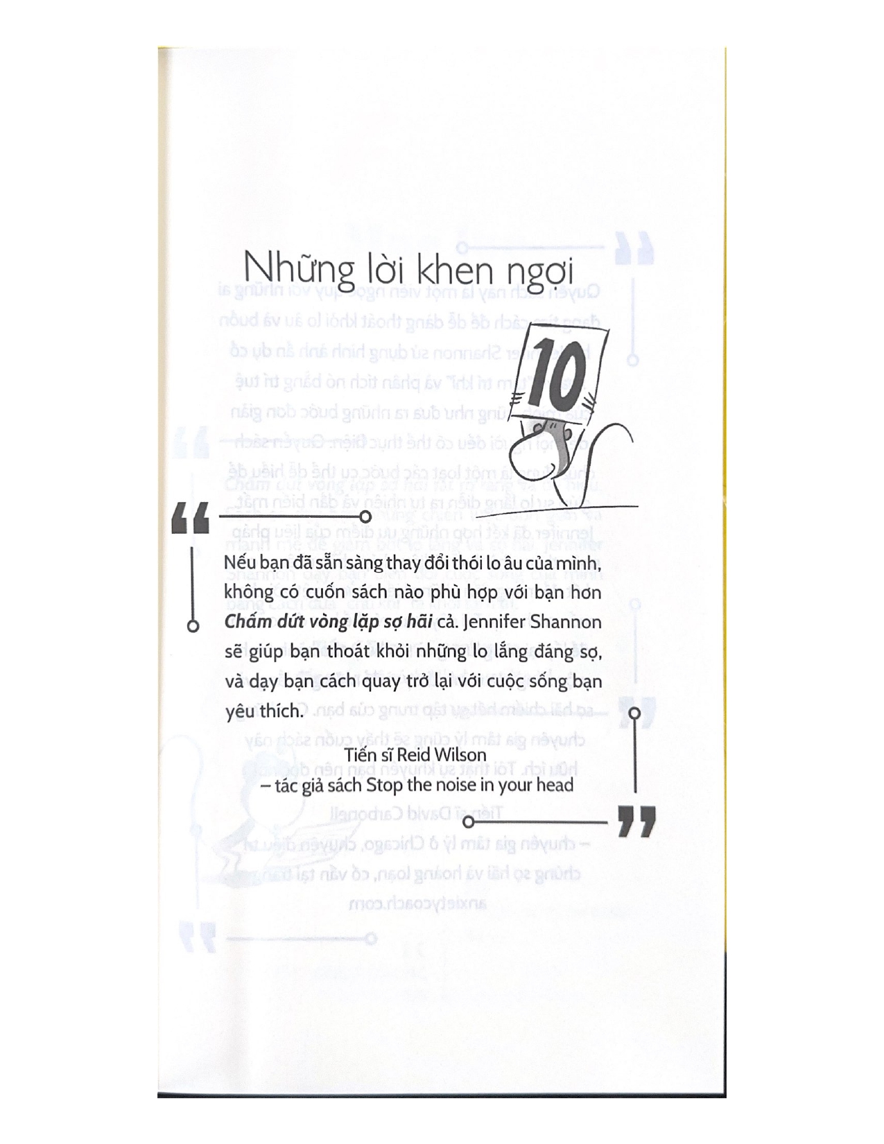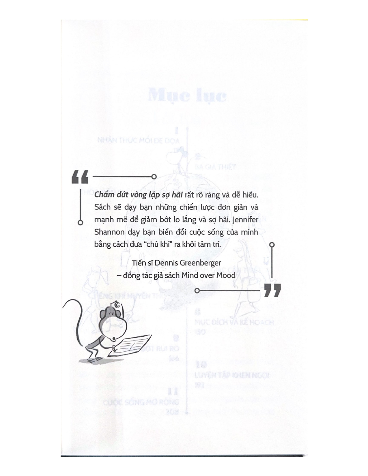 - Giới thiệu Chấm Dứt Vòng Lặp Sợ Hãi - Don't Feed the Monkey Mind “Nếu bạn đã sẵn sàng thay đổi thói lo âu của mình, không có cuốn sách nào phù hợp với bạn hơn CHẤM DỨT VÒNG LẶP SỢ HÃI” – Reid Wilson, PhD. – tác giả sách Stop the noise in your head (Tạm dịch: Dừng tiếng ồn trong tâm trí) Đừng để “tâm trí khỉ” điều khiển cuộc sống của bạn Các nhà hiền triết xưa ví von tâm trí đầy lo âu của chúng ta như tâm trí loài khỉ – lúc nào cũng náo động, nhảy từ cành này sang nhánh nọ và không ngừng tìm kiếm sự an toàn, tránh mối đe dọa. Nếu lúc nào cũng lo lắng và sợ hãi, có lẽ bạn đã quá quen với “tâm trí khỉ”. Và giống như loài khỉ, có lẽ bạn cũng luôn cố tránh những thứ làm mình sợ hãi. Nhưng sự né tránh – thứ mà chúng ta gọi là “cho khỉ ăn” – lại không hiệu quả chút nào. Trên thực tế, nó còn khiến ta lo lắng nhiều hơn.