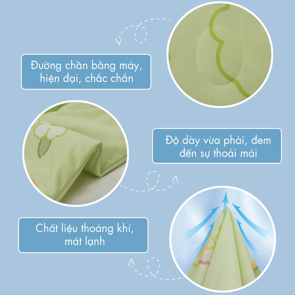 Chất liệu: Vải bên ngoài: Cotton nhung Gòn bên trong: Gòn Microfiber - Kích thước: 220x230 cm - Mật độ sợi: 520 TC (Thread Count) - Tính năng vượt trội: Thiết kế trẻ trung, năng
