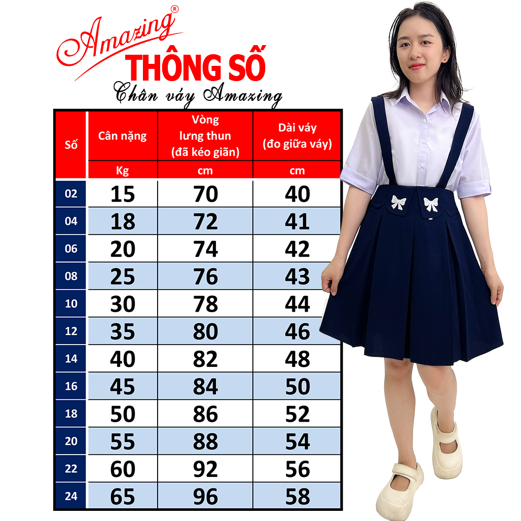 Váy rời đi học xinh xắn cho công chúa nhỏ, đặc biệt là có quần bên trong và có túi đựng đồ Chân váy bé gái cấp 1 và 2, kiểu dáng rất dể thương Chất vải lụa gân dày mềm, rủ và bung xòe cưng xỉu, không nhàu nát, rất dễ ủi Shop có bán thêm áo cổ sen tay phồng, áo sơmi trắng tay ngắn, tay lỡ và tay dài để mix chung bộ, Mẹ tìm thêm trong shop ạ ! Mua càng nhiều, giá càng giảm nữa nhé! Cách chọn size:  Mẹ dựa vào cân nặng và vòng bụng của bé để chọn size, nếu bé có cái bụng tròn tròn thì Mẹ lưu ý thêm số đo vòng bụng của váy khi chưa kéo giãn dây chun và số đo khi đã kéo giãn chun hết cỡ rồi. Các chỉ số trong bảng thông số không hoàn toàn chính xác, sai số +-2cm, số cân nặng cũng trong khoảng ước chừng, còn tùy thuộc vào chiều cao và vòng bụng của bé!  Lời khuyên là Mẹ nên chọn tăng lên 1 2 size vì bé tuổi này mau lớn lắm ạ ! Chính sách hậu mãi: Cam kết luôn cung cấp sản phẩm đẹp như mô tả, hình ảnh và video được quay chụp thực tế tại studio của công ty, hàng luôn có sẳn tại kho. Có thể giao hàng gấp trong vòng vài tiếng đồng hồ làm việc (khu vực TP HCM) Tư vấn nhiệt tình, hỗ trợ đổi size nếu không vừa  Đổi trả theo quy định của sàn