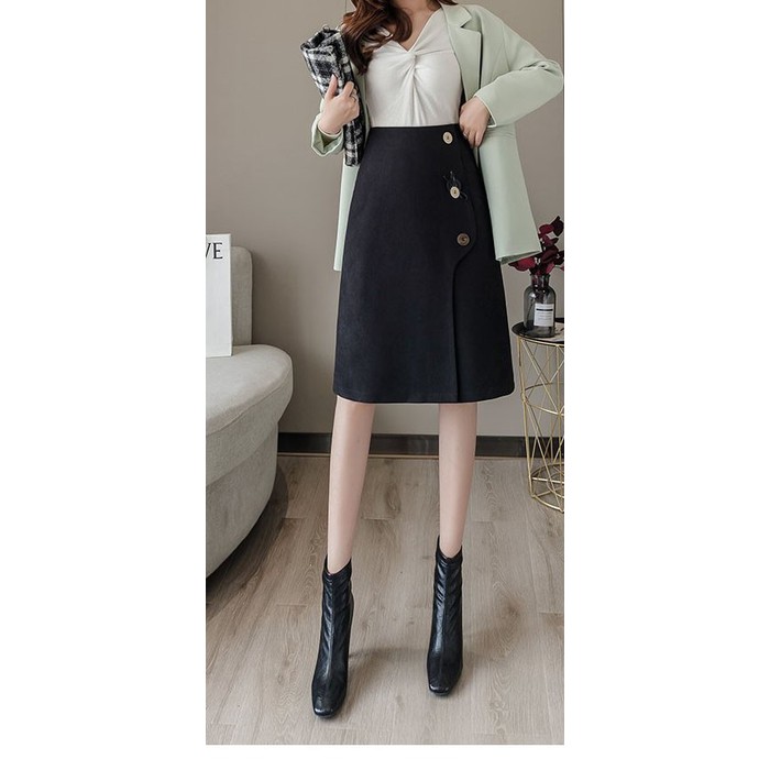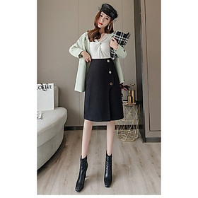 - Kiểu dáng: Chân váy form chữ A phối nút.
