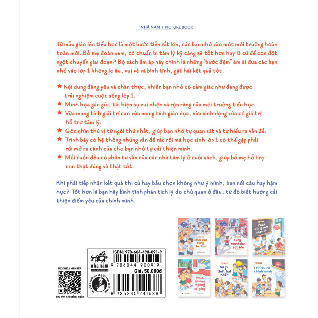 Từ mẫu giáo lên tiểu học là một bước tiến rất lớn, các bạn nhỏ vào một môi trường hoàn toàn mới. Bố mẹ đoán xem, có chuẩn bị tâm lý kỹ càng sẽ tốt hơn hay là cứ để con đột ngột chuyển giai đoạn? Bộ sách ấm áp này chính là những “tấm nệm” êm ái đưa các bạn nhỏ vào lớp 1 không lo âu, vui vẻ và bình tĩnh, gặt hái kết quả tốt.