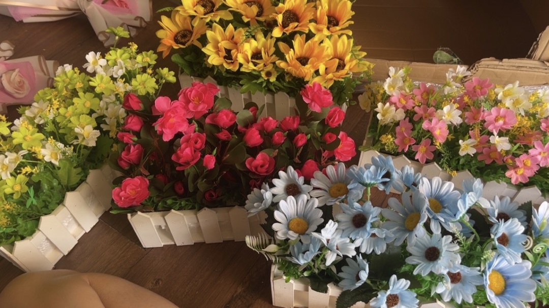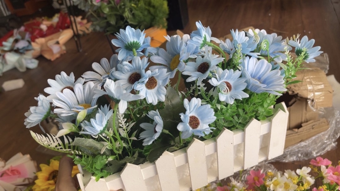 Giỏ hoa hàng rào gỗ dài 50cm cắm sẵn nhiều mẫu hoa giả, cây cảnh trang trí nhà cửa, ban công, tiểu cảnh Khi cần trang trí không gian nội thất căn hộ, ban