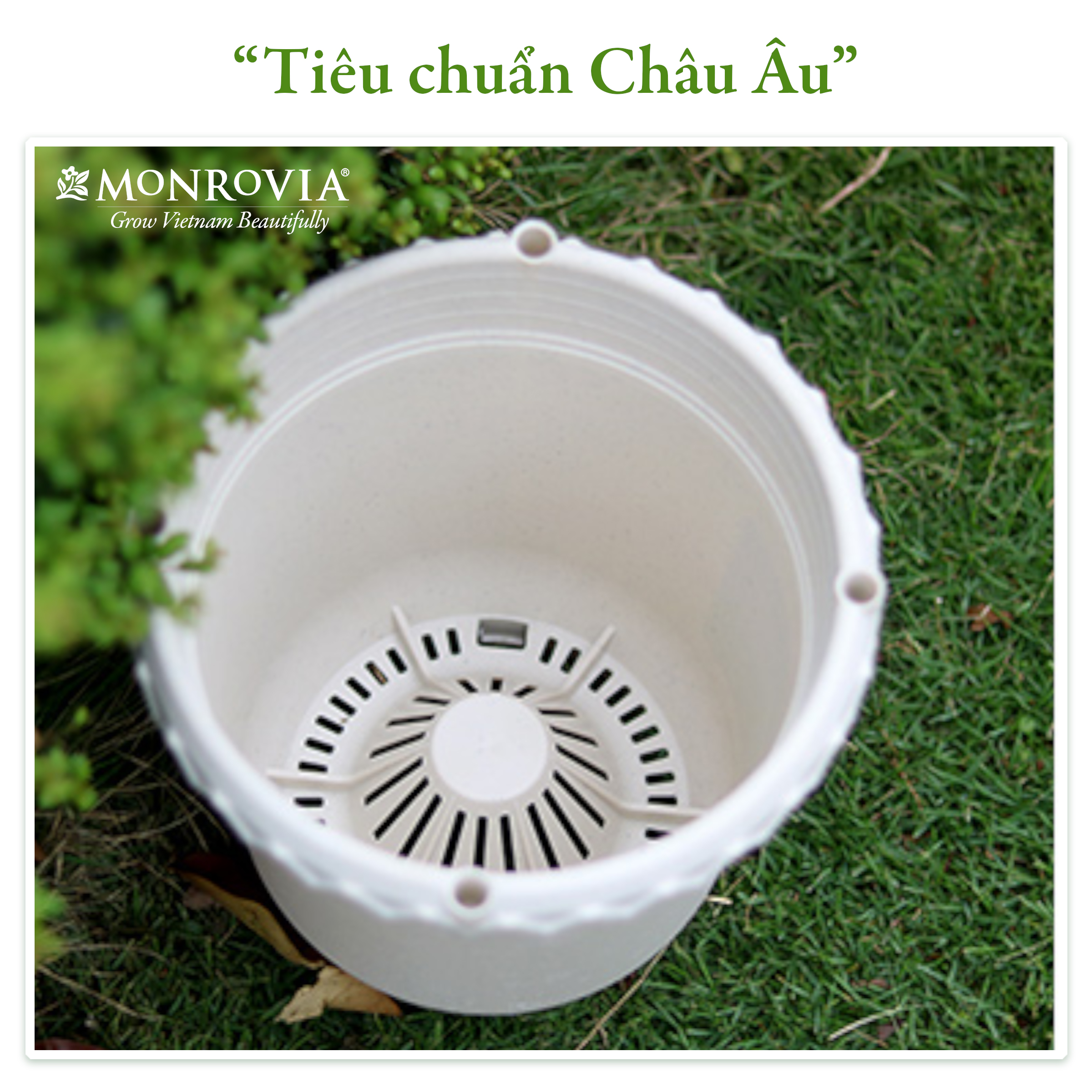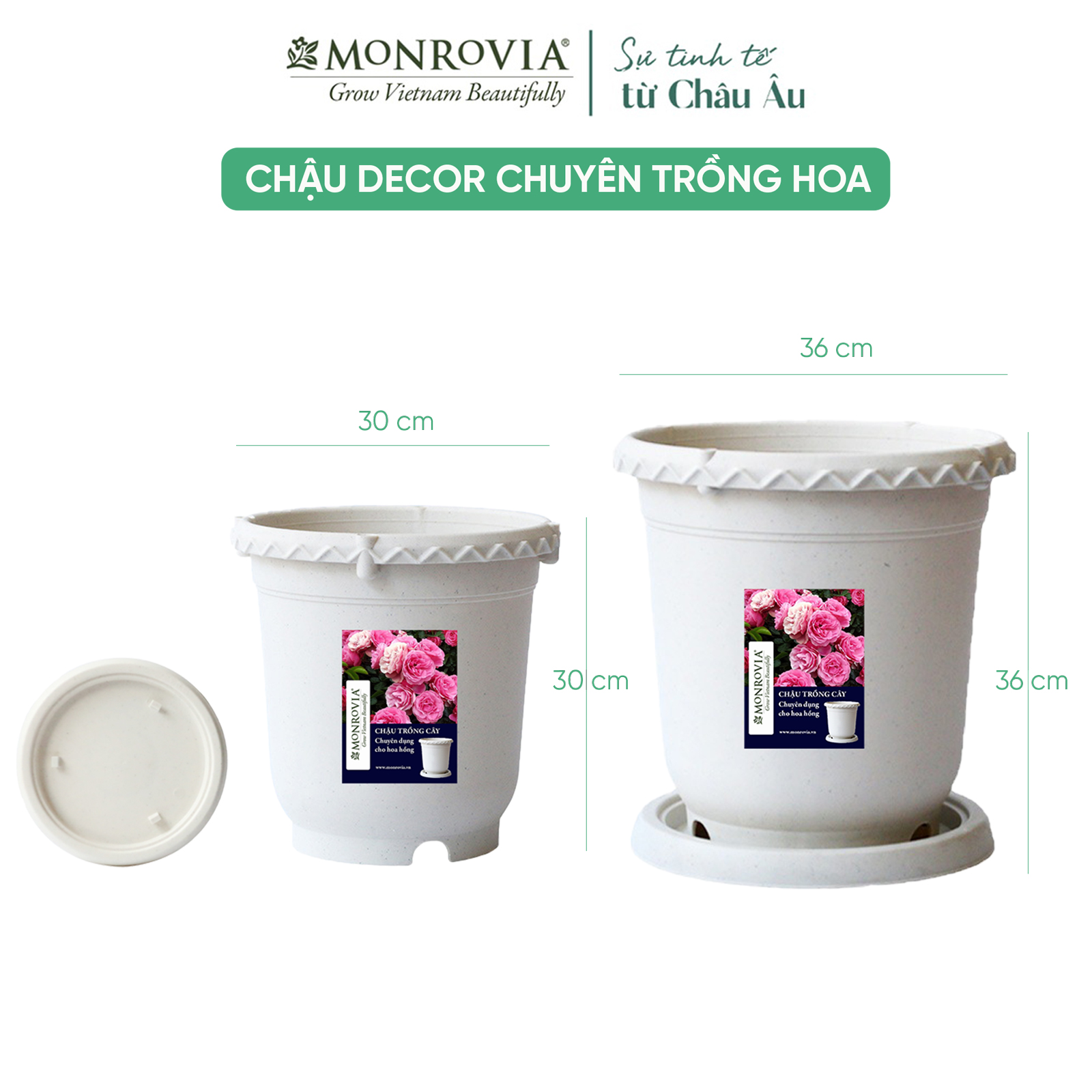 Chậu trồng cây Monrovia chuyên cho hoa hồng, cây cảnh, thiết kế tinh tế, tiêu chuẩn Châu Âu.   Với thương hiệu đến từ Châu Âu, chậu trồng cây Monrovia chuyên cho hoa hồng sẽ mang đến từng ngóc ngách khu vườn của bạn sự sang trọng và tinh tế, tạo nguồn cảm hứng làm vườn bất tận.   ĐẶC BIỆT:     -Chất liệu từ nhựa PP nguyên sinh cao cấp. -Nhẹ, rất chắc chắn và bền màu, dễ dàng di chuyển tiện lợi cho việc bày trí và xắp xếp khu vườn của bạn. -Chậu có khả năng cách nhiệt tốt giúp ổn định nhiệt độ của đất trong chậu hổ trợ bộ rễ của cây phát triển bình thường. -Đặc biệt, vệ sinh chậu cũng rất dễ dàng, bởi chậu được làm từ nhựa cao cấp không thấm nước nên khi chậu bị bám bụi chỉ cần dùng khăn lau nhẹ là chậu đã được sạch ngay.     Được thiết kế bề mặt mờ tinh tế, tối giản, với hai màu trắng ngọc trai hoặc màu gốm hiện đại đi kèm đĩa lót cùng màu, chậu mang lại vẻ đẹp sang trọng, đẳng cấp và thời thượng. Chậu trồng cây phù hợp cho các loại hoa và cây cảnh đặc biệt như hoa hồng.     Đế thoát nước thông minh, giúp tăng độ thông thoáng tối đa cho cây trồng hạn chế ngập úng cây đi kèm là đĩa lót giữ cho sàn nhà không bị dính nước khi tưới cây và còn giúp bạn tiết kiệm thời gian tưới, khi bạn vắng nhà không lo cây héo ( Nước thừa sau khi tưới sẽ thẩm thấu ngược lại khi cây thiếu nước ).   Với hai size chậu đường kích 30cm và 35cm sẽ phù hợp với từng giai đoạn phát triển của cây và các dòng cây khác nhau dễ dàng lựa chọn. Vì vậy, khi nhắc đến chậu trồng hoa hồng, Chậu trồng cây Monrovia chuyên cho hoa hồng sẽ là sự lựa chọn đầu tiên dành cho người dùng.     Với thiết kế đặc biệt đồng bộ với khung hoa hồng của Monrovia, mang vẻ đẹp tinh tế, quyến rũ, giúp vườn hồng của bạn trở nên khoe sắc, là không gian bình yên tĩnh lặng của tâm hồn giữa nơi đô thị phố ồn ào, náo nhiệt.
