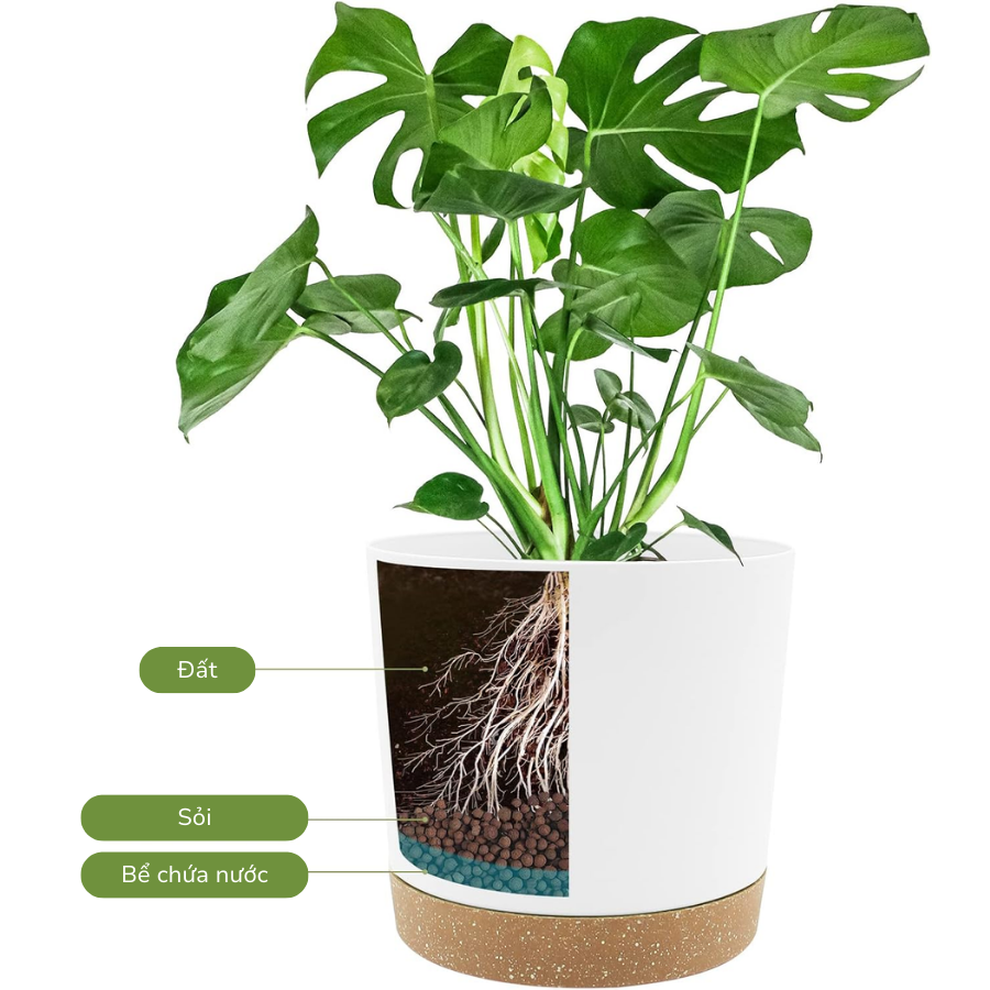 Chậu trồng cây tự tưới nước: Có 3 lỗ thoát nước để tưới nước và đơn giản hóa việc chăm sóc cây, giúp bạn dễ dàng tưới nước cho cây và tránh tắc nghẽn, thiết kế khóa độc đáo cho phép đĩa lót gắn vào chậu để dễ di chuyển và giữ nước. Bạn cũng có thể tháo đĩa lót ra để vệ sinh dễ dàng.