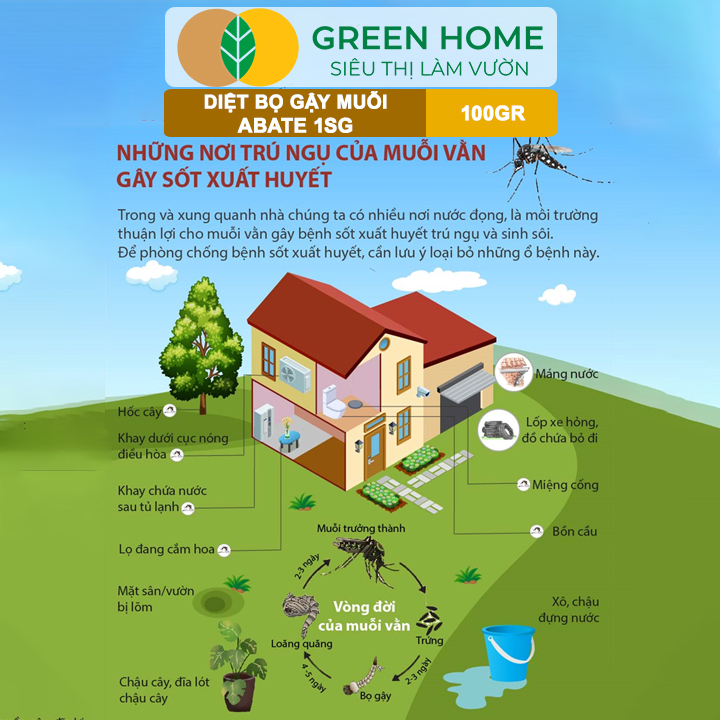 ✨Chế Phẩm Diệt Bọ Gậy, Muỗi Greenhome, Abate 1SG, Chai 100Gr, Ngắn Ngừa Bệnh Sốt Xuất Huyết, Sốt Rét