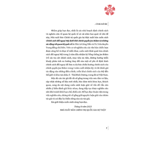 Nhằm giúp bạn đọc, nhất là các nhà hoạch định chính sách và nghiên cứu về quan hệ quốc tế có cái nhìn bao quát về chủ đề này, Nhà xuất bản Chính trị quốc gia Sự thật xuất bản cuốn sách Chính sách đối ngoại Mỹ dưới thời chính quyền Joe Biden và những tác động tới quan hệ quốc tế do ThS. Lê Công Tiến và TS. Trần Huyền Trang đồng chủ biên. Trên cơ sở nghiên cứu các văn bản chiến lược được công bố và thực tế triển khai, cuốn sách khái quát hóa chính sách đối ngoại Mỹ trong 2 năm đầu nhiệm kỳ Tổng thống Joe Biden (về các trụ cột chính sách, mục tiêu ưu tiên, đường hướng triển khai); phân tích xu hướng thay đổi của một số yếu tố định hình chính sách đối ngoại để đưa ra dự báo chiều hướng chính sách của chính quyền Joe Biden trong 2 năm cuối nhiệm kỳ; từ đó đánh giá tác động của những điều chỉnh, triển khai chính sách của Mỹ đến thế giới và khu vực châu Á - Thái Bình Dương, trong đó có Việt Nam.