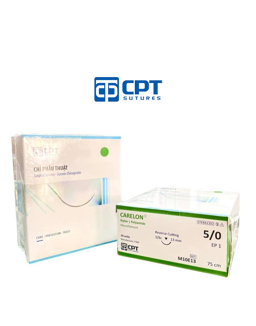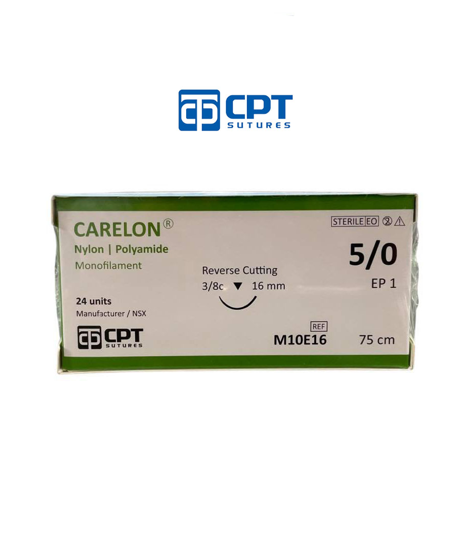 - Chỉ phẫu thuật không tiêu CPT Carelon Nylon: size cỡ chỉ: 5/0 USP, dài 75 cm, kim tam giác 3/8c, dài 13 mm, mã hàng: M10E13.