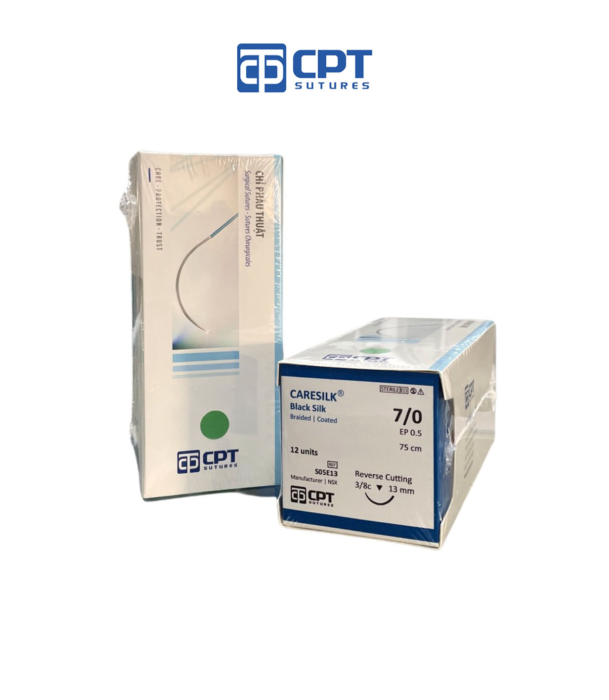 Chỉ phẫu thuật không tiêu Caresilk Silk: size cỡ chỉ: 7/0 USP, dài 75 cm, kim tam giác 3/8c, dài 13 mm, mã hàng: S05E13. Quy cách đóng gói: 12 tép. THÀNH PHẦN: