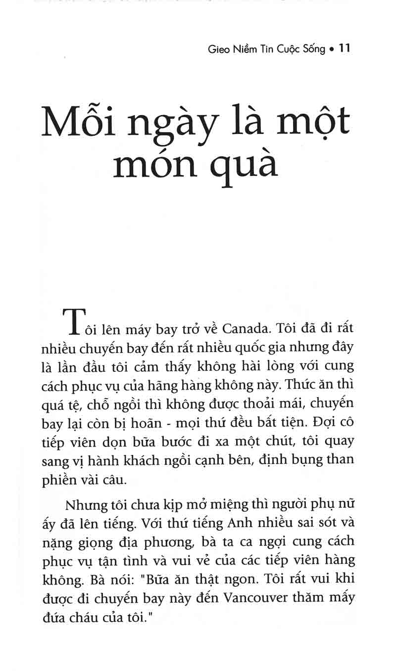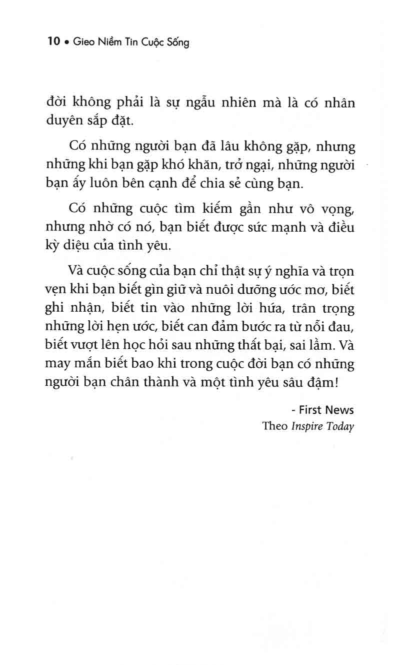 Gieo Niềm Tin Cuộc Sống cũng mong muốn gửi đến bạn đọc một thông điệp như thế. Cuốn sách mà bạn đang cầm trên tay là tập hợp những mẩu chuyện ngắn, súc tích mà cảm động – một vài trong số đó là những câu chuyện có thật. Chỉ là những trang viết ngắn ngủi nhưng thật sự ẩn chứa sức mạnh bằng ngàn lời an ủi, động viên.