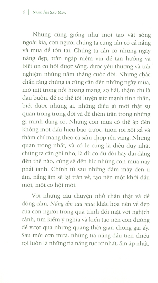 Mỗi câu chuyện, như một sắc màu, lại chuyển tải một thông điệp khác nhau, cho chúng ta cơ hội chiêm nghiệm những cung bậc và sắc màu đa dạng của cuộc sống. Dù là bài ca về tình đôi lứa, nghĩa vợ chồng hay khúc hát về tình mẫu tử, thì những câu chuyện nhỏ này cũng gửi gắm đến ta thông điệp về ý nghĩa và sức mạnh của tình yêu thương. Ở một thời điểm nào đó, khi đang chìm trong màu xám xịt tối tăm của lo lắng, tuyệt vọng thì chỉ cần một ánh mắt đồng cảm, một nụ cười thân ái hay một cái xiết tay khích lệ cũng đủ để ta đứng thẳng dậy, dũng cảm bước qua những tháng ngày tăm tối, tìm lại ánh dương tươi sáng cho cuộc đời mình.