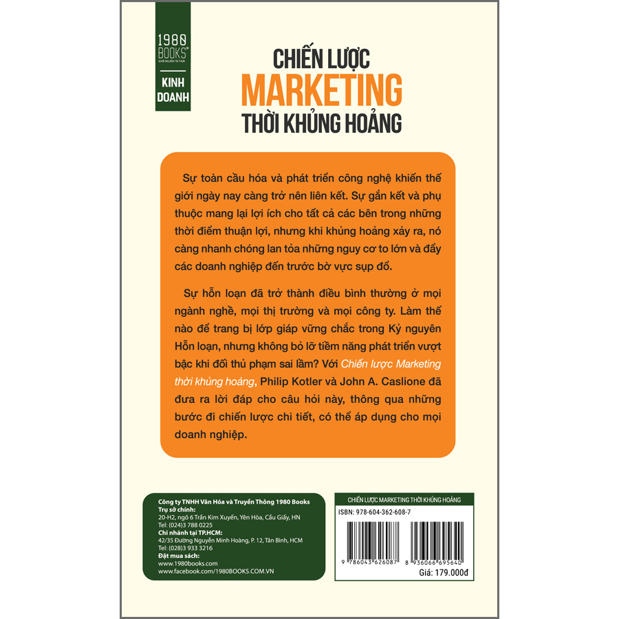“Chiến lược Marketing Thời Khủng hoảng”cuốn sách được viết bởi tác giả Philip Kotler – cha đẻ của ngành Marketing trên toàn thế giới. Đây là cuốn cẩm nang hướng dẫn vận hành, giúp đội ngũ quản lý có thể lèo lái công ty của họ vượt qua thảm họa toàn cầu. Với những hướng dẫn súc tích, thực tế, được kiểm định kỹ lưỡng, cuốn sách này sẽ giúp các nhà quản lý xác định, và ngăn chặn các cuộc khủng hoảng tiềm ẩn với đầy đủ các công cụ cần thiết, từ cách chuẩn bị danh sách khẩn cấp, sử dụng tài nguyên, đến hướng dẫn xử lý khủng hoảng thành công. Bám sát những thực tiễn đang diễn ra và dự đoán xu hướng trong tương lai, cuốn sách chỉ ra những thách thức mà doanh nghiệp phải đối mặt, chỉ ra điểm yếu và cơ hội từ “khó khăn và hỗn loạn”, phân tích những sai lầm từ phương thức các nhà quản lý ứng phó, qua đó thiết kế nên một hệ thống quản lý, tiếp thị bền bỉ, đưa công ty trở thành doanh nghiệp kinh doanh bền vững.