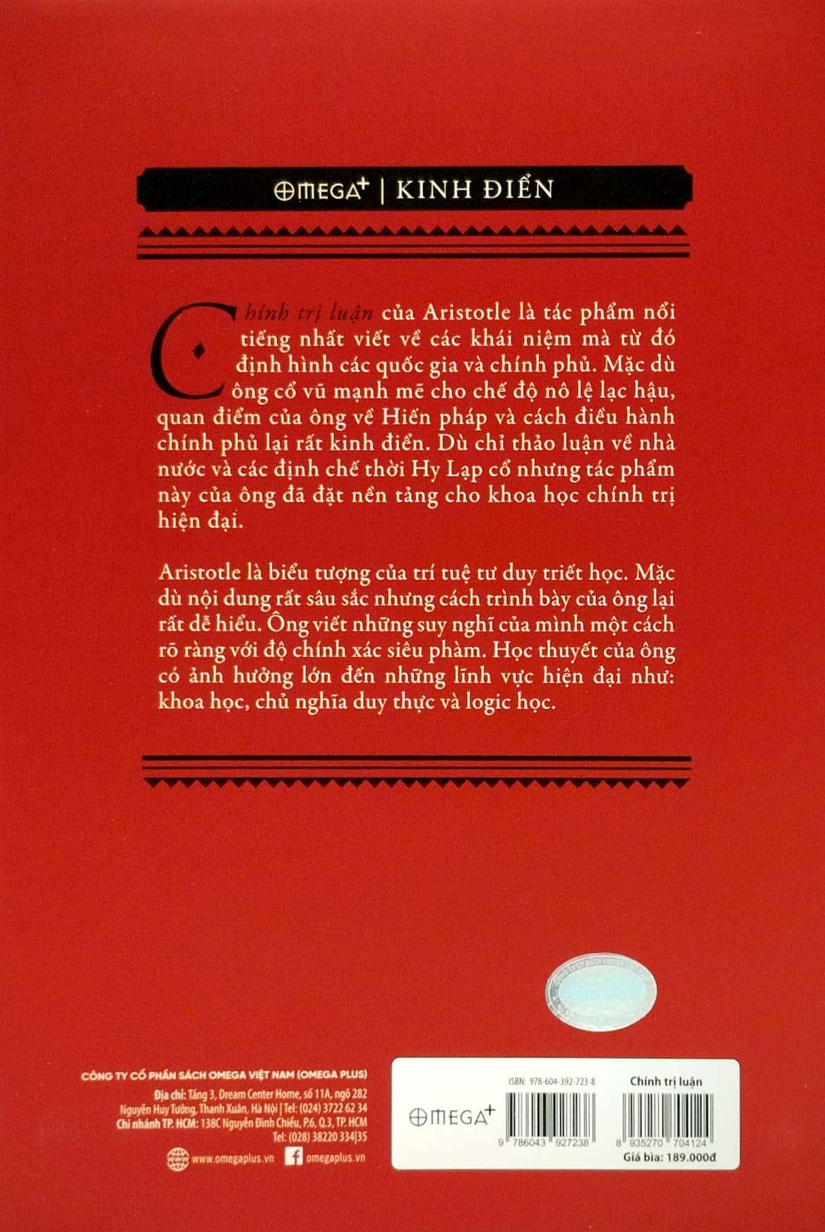 Tác phẩm này được xem là căn bản cho Chính trị học Tây phương. Chính trị luận nghiên cứu các vấn đề cơ bản về nhà nước, chính quyền, chính trị, tự do, công bằng, tài sản, quyền, luật và việc thực thi luật pháp của các cơ quan thẩm quyền.
