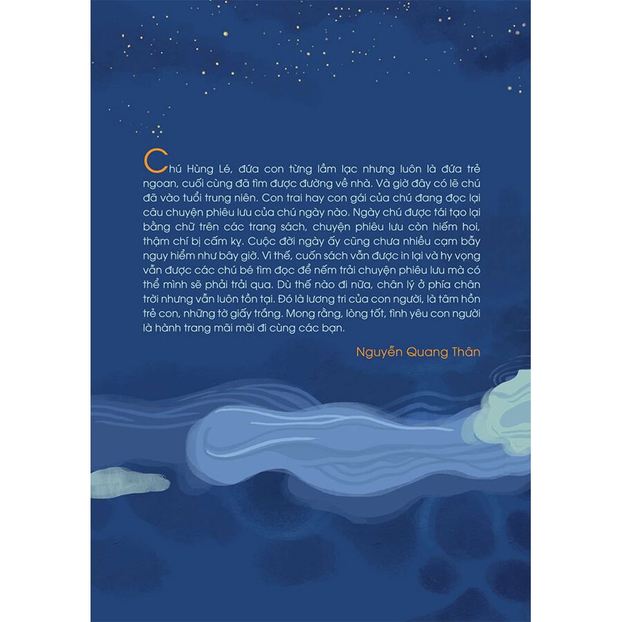 "Hùng Lé, đứa con từng lầm lạc nhưng luôn là đứa trẻ ngoan, cuối cùng đã tìm được đường về nhà. Và giờ đây có lẽ chú đã vào tuổi trung niên. Con trai hay con gái của chú đang đọc lại câu chuyện phiêu lưu của chú ngày nào. Ngày chú được tái tạo lại bằng chữ trên các trang sách, chuyện phiêu lưu còn hiếm hoi, thậm chí bị cấm kỵ. Cuộc đời ngày ấy cũng chưa nhiều cạm bẫy nguy hiểm như bây giờ. Vi thế, cuốn sách vẫn được in lại và hy vọng vẫn được các chú bé tìm đọc để nếm trải chuyện phiêu lưu mà có thể mình sẽ phải trải qua. Dù thế nào đi nữa, chân lý ở phía chân trời nhưng vẫn luôn tồn tại. Đó là lương tri của con người, là tâm hồn trẻ con, những tờ giấy trắng. Mong rằng, lòng tốt, tình yêu con người là hành trang mãi mãi đi cùng các bạn." (Nguyễn Quang Thân)