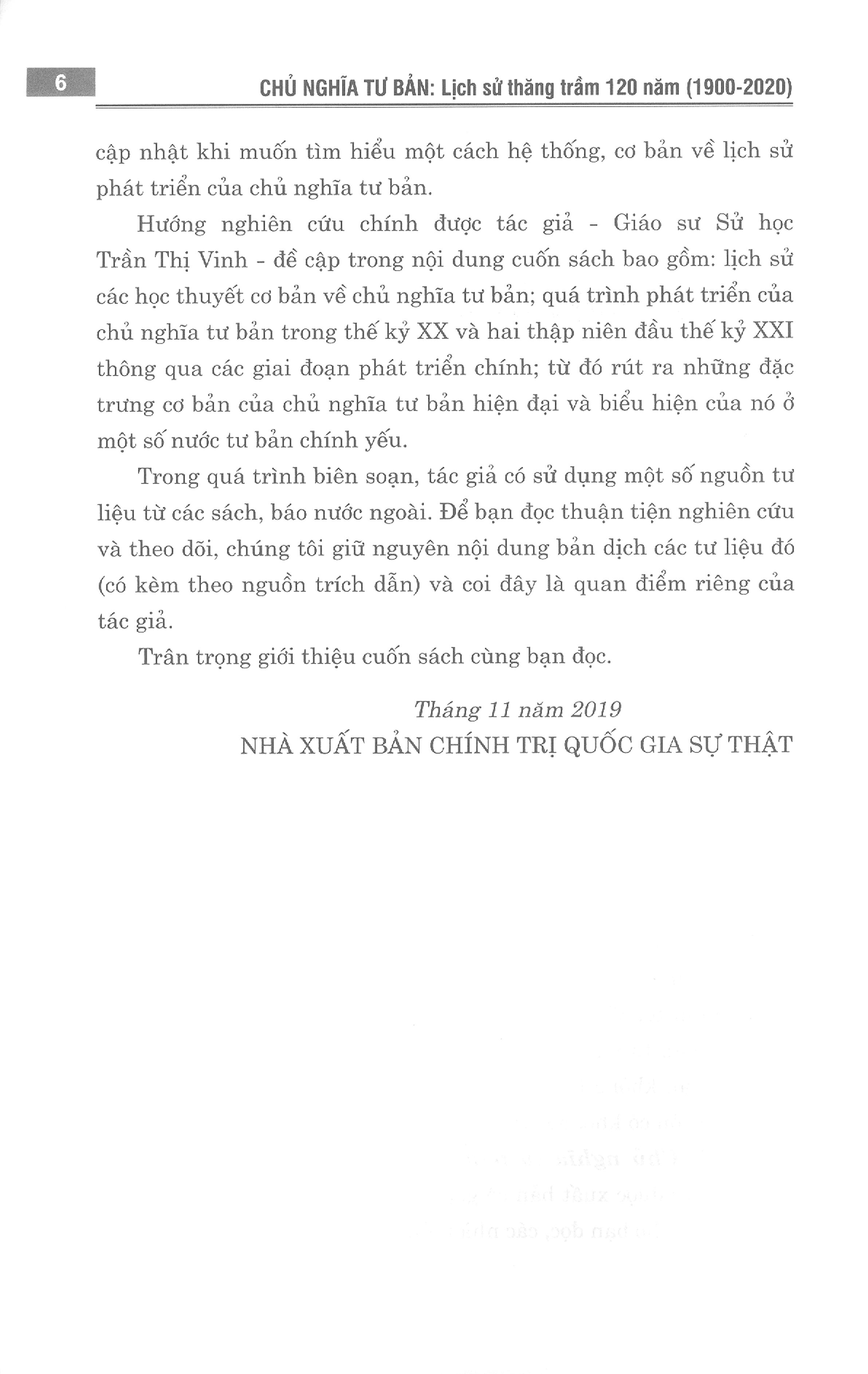 Trong lịch sử tồn tại gần năm thế kỷ, sự phát triển của chủ nghĩa tư bản trong thế kỷ XX và hai thập niên đầu thế kỷ XXI đóng vai trò đặc biệt quan trọng. Trong thời kỳ này, chủ nghĩa tư bản đã châm ngòi cho hai cuộc chiến tranh thế  giới đến nay là lớn nhất trong lịch sử nhân loại, đồng thời đã trải qua những bước phát triển thăng trầm, với những đỉnh cao chưa từng thấy cũng như những cuộc khủng hoảng, suy thoái lớn nhất về kinh tế, xã hội. Chủ nghĩa tư bản đã trở thành một trong những chủ thể giữ vị trí then chốt trong tiến trình phát triển của lịch sử nhân loại.             Ở nước ta, các công trình nghiên cứu về chủ nghĩa tư bản chủ yếu tập trung vào các khía cạnh kinh tế chính trị học hoặc thuần túy về kinh tế. Việc nghiên cứu, xem xét sự thăng trầm của chủ nghĩa tư bản trong thế kỷ XX và hai thập niên đầu thế kỷ XXI – một bộ phận không thể tách rời trong dòng chảy của lịch sử nhân loại – vẫn còn có khaonrg trống. Do vậy, với cách tiếp cận từ lịch sử, cuốn sách Chủ nghĩa tư bản: Lịch sử thăng trầm 120 năm (1900-2020) được xuất bản sẽ góp phần khỏa lấp khoảng trống đó và cung cấp cho bạn đọc, các nhà nghiên cứu nguồn tư liệu hữu ích, cập nhật khi muốn tìm hiểu một cách hệ thống, cơ bản về lịch sử phát triển của chủ nghĩa tư bản.             Cuốn sách gồm hai phần:             Phần thứ nhất: Một số vấn đề lý luận             Phần thứ hai: Sự phát triển thăng trầm của chủ nghĩa tư bản (1900-2020).