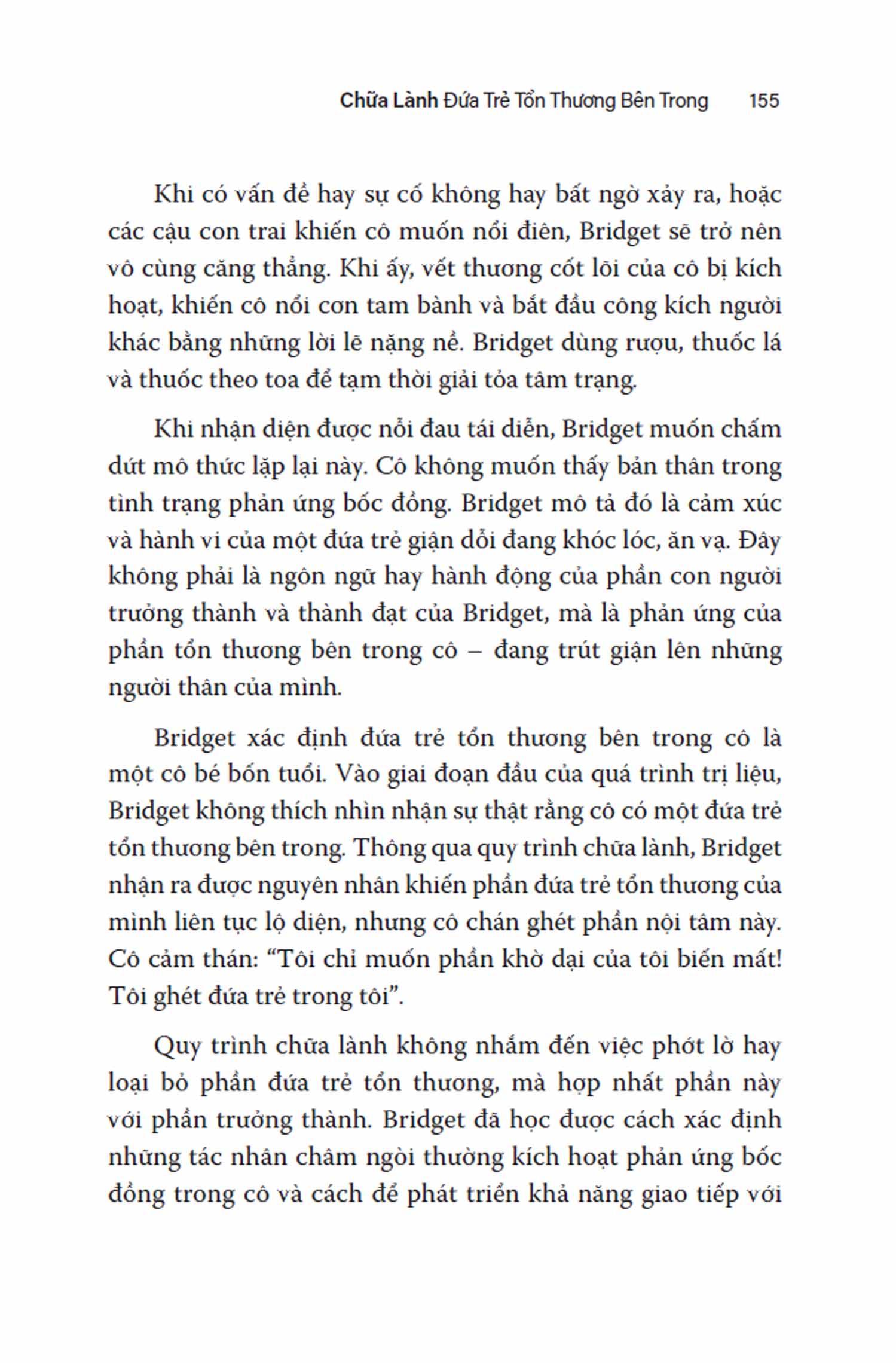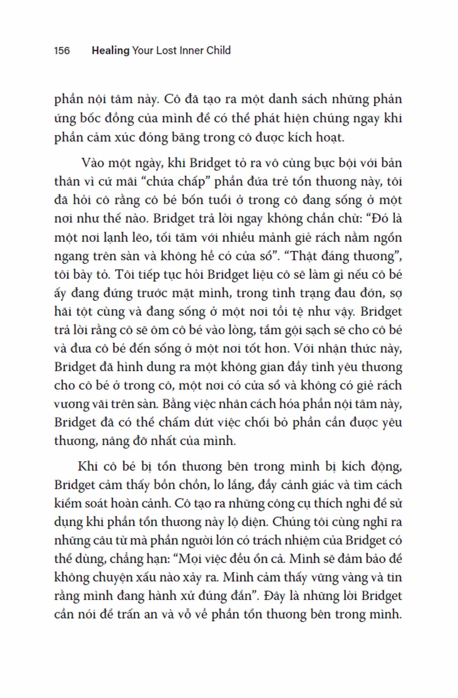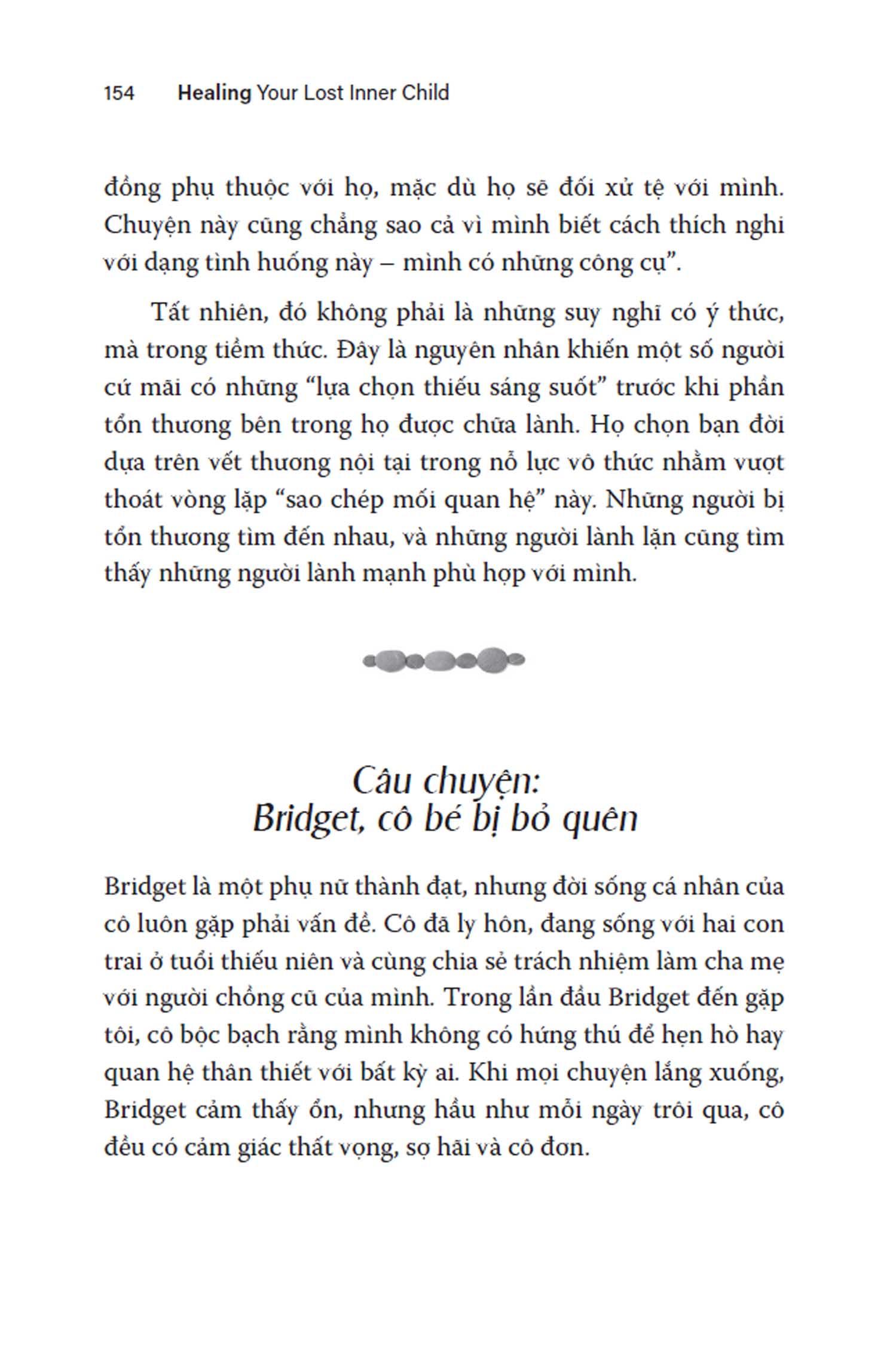 Chữa Lành Đứa Trẻ Tổn Thương Bên Trong “Chữa lành đứa trẻ tổn thương bên trong” Vượt qua vết thương thời thơ ấu để sống cuộc đời trọn vẹn Có thể bạn từng hỏi bản thân những câu hỏi sau đây: “Sao những chuyện tệ hại này cứ xảy đến với tôi?”; “Sao tôi cứ mãi thấy tức giận, đau khổ, trống rỗng và không trọn vẹn?”; “Làm sao để vết thương lòng từ thơ ấu không đeo đẳng tôi đến suốt đời?” Nếu bạn đang trên con đường chữa lành những vết thương tâm hồn và bạn đang tìm kiếm một lộ trình chi tiết, dễ hiểu, “Chữa lành đứa trẻ tổn thương bên trong” (“Healing Your Lost Inner Child”) chính là cuốn sách bạn cần. Cuốn sách được đúc kết từ 20 năm kinh nghiệm trị liệu cùng với trải nghiệm cá nhân của tác giả Robert Jackman – một chuyên gia trị liệu tâm lý được chứng nhận và là một tác giả sách bán chạy. Theo Robert Jackman, khái niệm “đứa trẻ tổn thương bên trong” chính là phần bên trong ta còn lưu giữ ký ức cảm xúc từ những trải nghiệm tổn thương trong quá khứ, như bị lạm dụng, bỏ mặc, hoặc những chấn thương tâm lý khác. Trong bốn chương đầu, tác giả mô tả sự hình thành những vết thương tâm hồn, giới thiệu các nhân tố kích hoạt và cách mà những ngòi nổ này kích hoạt đứa trẻ tổn thương bên trong ở tuổi trưởng thành, đẩy ta vào những vòng lặp của phản ứng bốc đồng và làm cho các mối quan hệ hiện tại trở nên tệ hại. Quy trình chữa lành được giải thích cụ thể hơn ở phần sau, có sự tham gia của “phần nội tâm lành lặn, chín chắn” bên trong mỗi người – mà Jackman gọi là “phần người lớn có trách nhiệm”, hay “phần trưởng thành”. Thông qua các bài tập và câu chuyện của những người đã được chữa lành cũng như của chính tác giả, cuốn sách hướng dẫn làm thế nào để thấu hiểu “đứa trẻ tổn thương” bên trong chính m.ình và cách để kết nối phần nội tâm này với “phần trưởng thành”. Chẳng hạn như nhìn lại dòng sự kiện thời thơ ấu, viết thư trao đổi giữa phần trưởng thành và phần tổn thương, liên hệ những phản ứng bốc đồng trong hiện tại với nguyên nhân trong quá khứ… Việc viết những lá thư chữa lành qua lại với chính m.ình là một cách tuyệt vời để nhanh chóng làm bộc lộ những cảm xúc và kết nối với phần tổn thương bên trong bạn. Bạn đọc cũng sẽ hiểu cách mà “phần người lớn có trách nhiệm” có thể phát triển một bộ công cụ hồi đáp mới, tích cực hơn, thay thế cho những kiểu phản ứng cũ của đứa trẻ tổn thương bên trong. Thiết lập các ranh giới lành mạnh là một nhiệm vụ quan trọng khác của “phần trưởng thành”. Theo Robert Jackman, ranh giới – khả năng nói “không”, sự cam kết về điều ta có thể và không thể chấp nhận – sẽ tạo một môi trường an toàn cho đứa trẻ bị tổn thương, giúp phần nội tâm này không còn phải phòng vệ, sợ hãi hay phản ứng bốc đồng… Tác giả viết: “Hệ thống ranh giới hiệu quả là chất keo kết dính giúp cho quy trình chữa lành được thực hiện đồng bộ”. Một khi đi qua quy trình chữa lành, bạn sẽ dần thấy m.ình không còn dễ bị kích động theo cách cũ nữa, mà bình tĩnh, tự do và nhẹ nhõm hơn. Phần đứa trẻ khổ đau bên trong bạn cũng sẽ dần hợp nhất với phần con người trưởng thành, giúp bạn chào đón một bản thể trọn vẹn, chân thật nhất của m.ình. Từ đây, bạn là người sáng tạo nên cuộc đời m.ình - thay vì chỉ hành động hay phản ứng một cách vô thức do những nỗi đau trong quá khứ. Bên cạnh hiểu biết và kinh nghiệm của bản thân, “Chữa lành đứa trẻ tổn thương bên trong” còn kế thừa những học thuyết, công trình nghiên cứu của nhà tâm lý học Carl Jung, tiến sĩ Eric Berne… cũng như các tác giả đương đại nổi tiếng. Xuyên suốt cuốn sách, Robert Jackman sử dụng văn phong gần gũi, nhẹ nhàng, tràn đầy sự thấu hiểu và cảm thông. Ông thường xuyên dùng những hình ảnh ẩn dụ khi chia sẻ các câu chuyện từ các thân chủ (được giấu tên) lẫn từ chính cuộc đời của m.ình để làm sáng tỏ những kiến thức chuyên sâu. Đặc biệt, nhiều bài thực hành và những câu hỏi tự vấn được sắp xếp có hệ thống sẽ giúp việc đọc sách như một quá trình tự soi tỏ bản thân thật nhẹ nhàng; quy trình chữa lành nhờ đó cũng trở nên thật cá nhân và hiệu quả với từng bạn đọc. “Chữa lành đứa trẻ tổn thương bên trong” lọt top 5 hạng mục sách tham vấn y tế (Medical Counseling) trên Amazon và đã được dịch sang 10 ngôn ngữ trên thế giới. Đây là nguồn tham khảo thiết yếu cho bất cứ ai cần chữa lành, cũng như sẽ giúp ích không ít cho các chuyên gia trị liệu tâm lý. Lời khen tặng dành cho cuốn sách