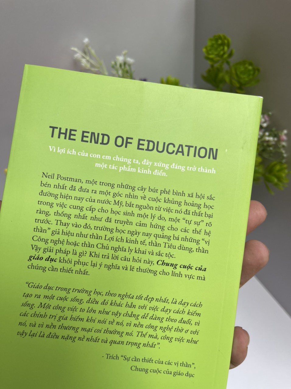 Cuốn sách chúng ta đang cùng nhau đọc Chung cuộc của giáo dục (The End of Education) được xuất bản lần đầu vào năm 1995, cách nay hơn một phần tư thế kỷ, khi nước Mỹ đang tìm kiếm những ý tưởng để cải cách giáo dục nhằm vượt qua khủng hoảng học đường. Liệu những gì được tác giả viết ra có là nỗi bận tâm của chúng ta, khi nền giáo dục của chúng ta cũng đang tìm đường “đổi mới căn bản và toàn diện”? Bạn sẽ có câu trả lời riêng sau khi đọc xong cuốn sách này.