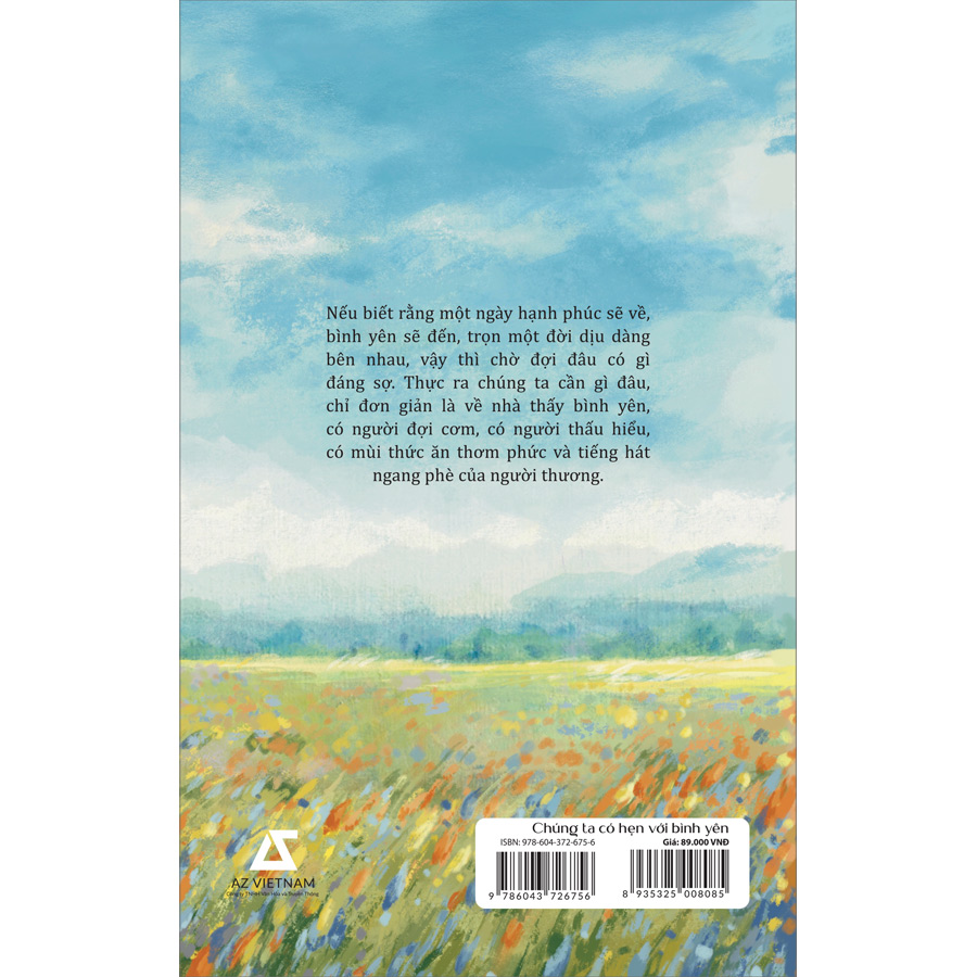 CHÚNG TA CÓ HẸN VỚI BÌNH YÊN là hành trình kiếm tìm sự yên bình sau những mối tình vỡ tan, đưa bạn đi qua những năm tháng thanh xuân từng xem một người là tất cả rồi bỗng chốc hóa hư không. Từng trang sách là những lời tâm sự, trải lòng đầy sự nuối tiếc nhưng cũng không kém phần nhẹ nhõm, kéo bạn khỏi lún sâu vào một bụi gai nhọn khi trót lỡ yêu một người không biết trân trọng mình… Bình yên chẳng ở đâu xa vời, chỉ khi bạn đã biết là đường cùng, nhất định phải quay đầu kịp lúc. Chúng ta đều xứng đáng được hạnh phúc, và sẽ hạnh phúc thôi.