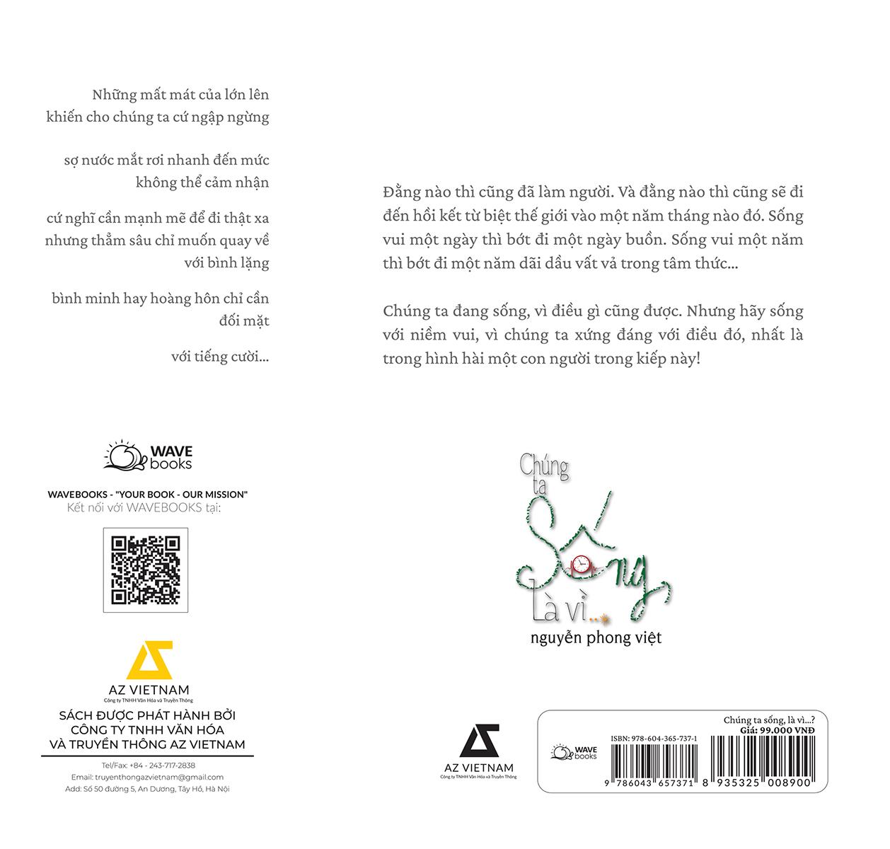 Chúng ta sống, là vì…? tập hơn 43 mẩu chuyện dài có, ngắn có, mang đậm dấu ấn và phong cách rất riêng mà Nguyễn Phong Việt đã ghi vào lòng độc giả của mình trong suốt những năm qua. Đó là những câu từ được viết ra bởi những chiêm nghiệm thực tế cộng hưởng với cảm xúc chân thành, mộc mạc của tác giả trước dòng chảy cuộc sống. Đó là những ký ức giản dị như món ăn tuổi thơ, những vấp váp trái tim đã trải qua trước khi cứng cáp hơn, và đó cũng có thể là tâm tư sau một năm đại dịch với nhiều mất mát, đổi thay. Cuốn sách này không quá lãng mạn như thơ, mà chứa nhiều góc cạnh hiện thực hơn.