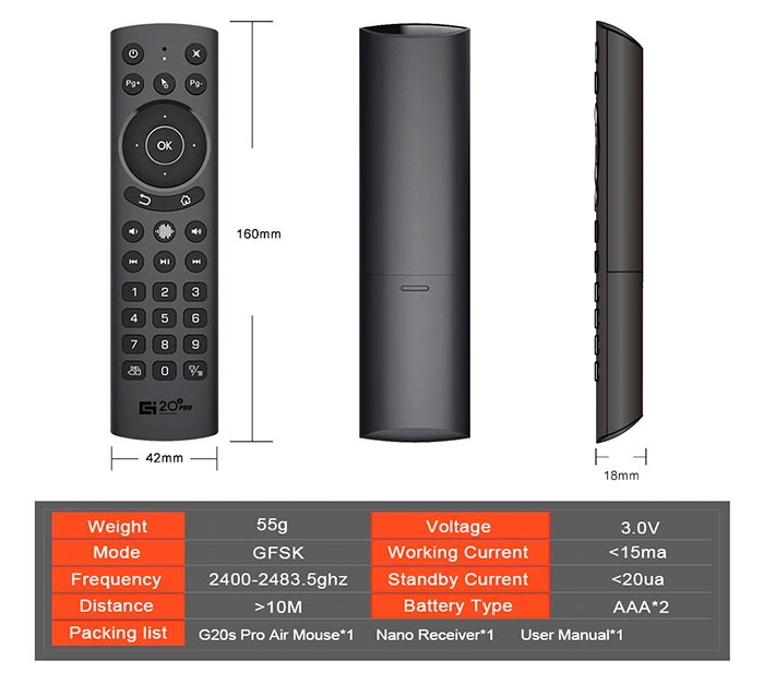 1 . Điều khiển G20S Pro BT là phiên bản có cả kết nối bluetooth , kết nối không dây 2.4G và hồng ngoại ., tương thích với hầu hết các thiết bị android , có 2 phím có thể học lệnh hồng ngoại được là nút nguồn và nút mute .