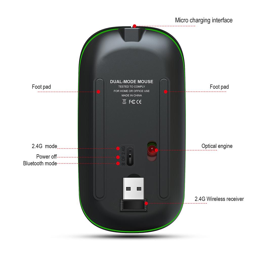 Features: Dual Mode BT5.0 + 2.4G wireless,you can switch the mouse freely and easily between 2 compouters just by a click on the mode key,easy and convenient to use. Rechargeable Mouse Built-in rechargeable lithium battery,no