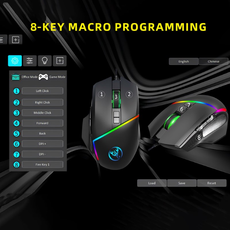 - Interface Type: USB. - Size: 128*72*41mm. - Key number: 8. - Chip: PMW3325. - Resolution: 1200-2400-3200-4800-7200-10000 DPI. - Operating Voltage: 5V/3.7V. - Key life: 20,000,000 times. - Cable Length: 1.6m. - With software - Product weight: 121g. - Battery Capacity: 600mah.