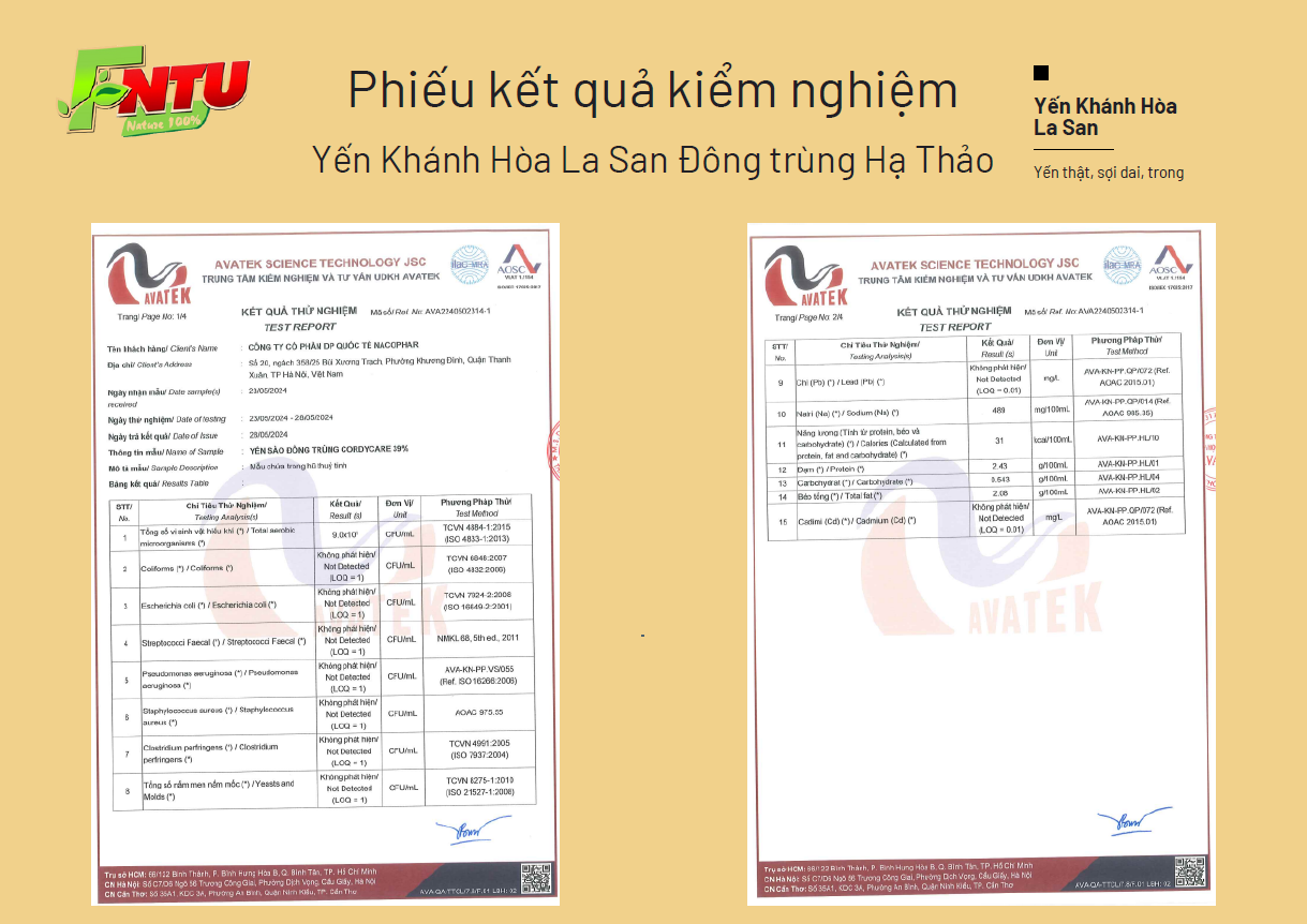 Thông tin sản phẩm : • Thành phần: Yến tươi tinh chế 35%, nước, đông trùng hạ thảo(4g), đường phèn, chất ổn định(E406,E401),hương liệu • Nơi sản xuất : Đại học Nha Trang - Khánh